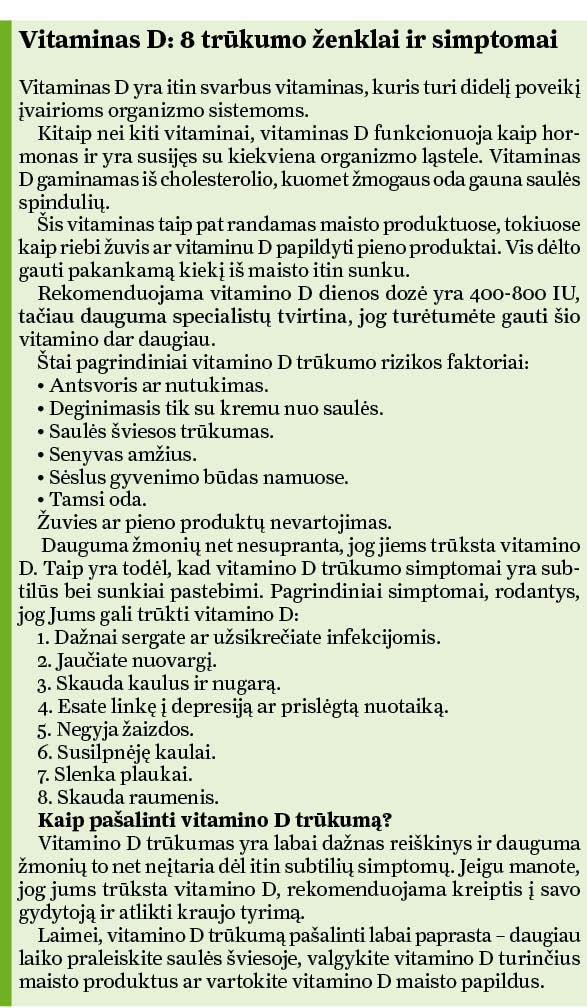 Jei jaučiate nuolatinį nuovargį, skauda kaulus ir raumenis, lėtai gyja žaizdos, kankina bloga nuotaika, ko gero, jums trūksta vitamino D. Kadangi svarbiausias šio vitamino gamybos šaltinis yra saulės spinduliai, didelė tikimybė, jog dabar, gyvenant po apniukusiu dangumi, daugeliui iš mūsų tikrai trūksta vitamino D.