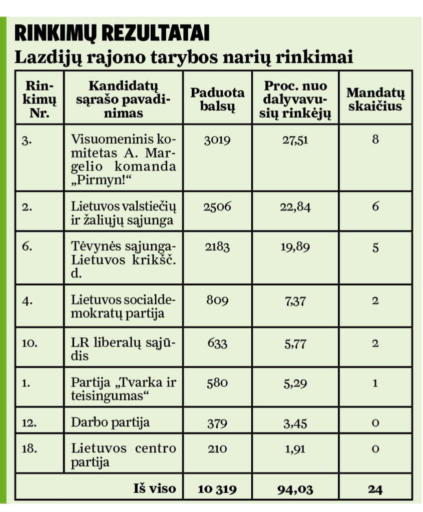 Lazdijų krašto žmonės savo poziciją išsakė tiesiai šviesiai – daugiausia balsų paskyrė visuomeniniam rinkimų komitetui A. Margelio komanda „Pirmyn!“, o merų rinkimuose nenugalimas buvo dabartinis Lazdijų vadovas Artūras Margelis.