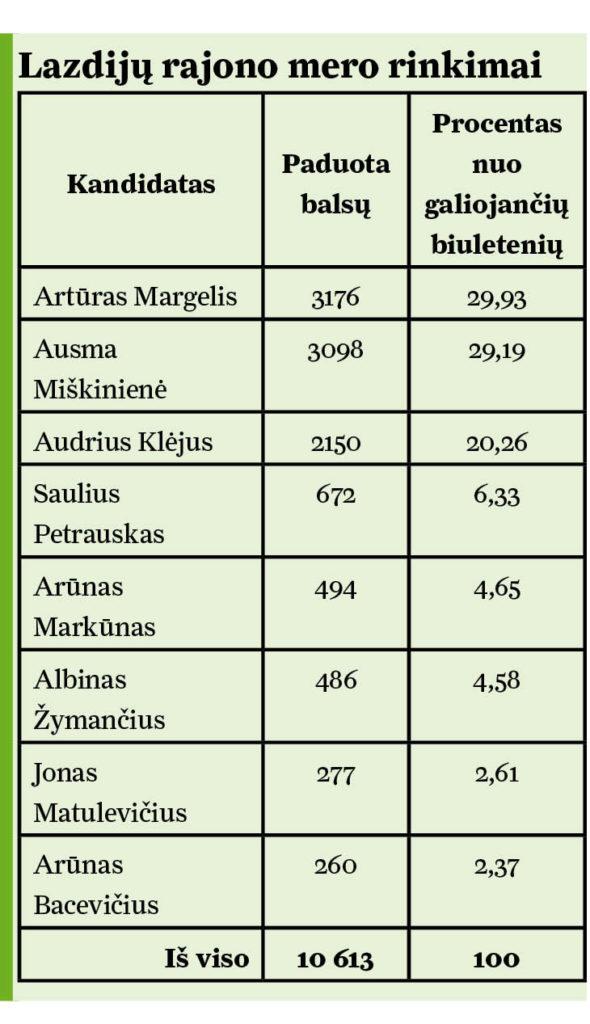 Į merų rinkimų antrąjį turą, kuris vyks kovo 17 dieną, pateko A. Margelio komandos „Pirmyn!“ vedlys Artūras Margelis ir antrąją vietą pirmajame ture užėmusi Lietuvos valstiečių ir žaliųjų sąjungos kandidatė Ausma Miškinienė.
