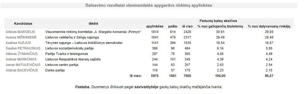 Kaip rodo Vyriausiosios rinkimų komisijos (VRK) duomenys, už dabartinį rajono vadovą A. Margelį balsavo 30,91 proc. lazdijiečių, už A. Miškinienę vos procentu mažiau – 29,49 proc. rinkėjų.