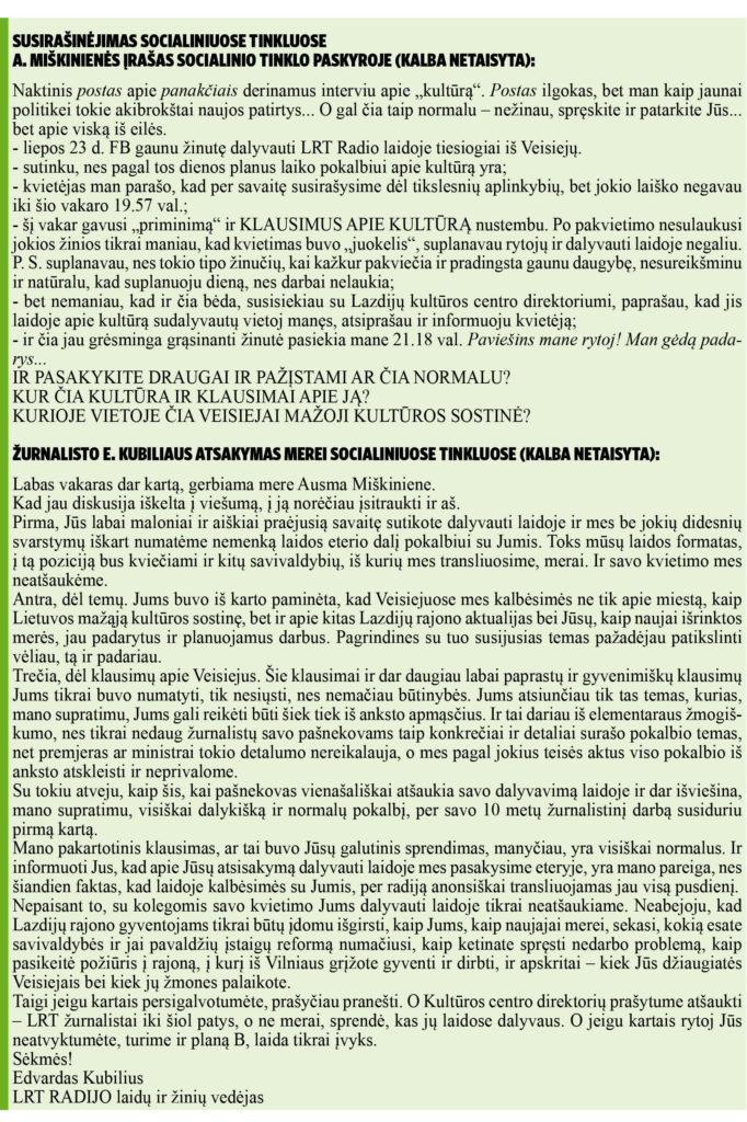 Tada E. Kubilius jai parašė, jog jis praneš per radiją, kad Lazdijų rajono merė atsisakė dalyvauti laidoje.