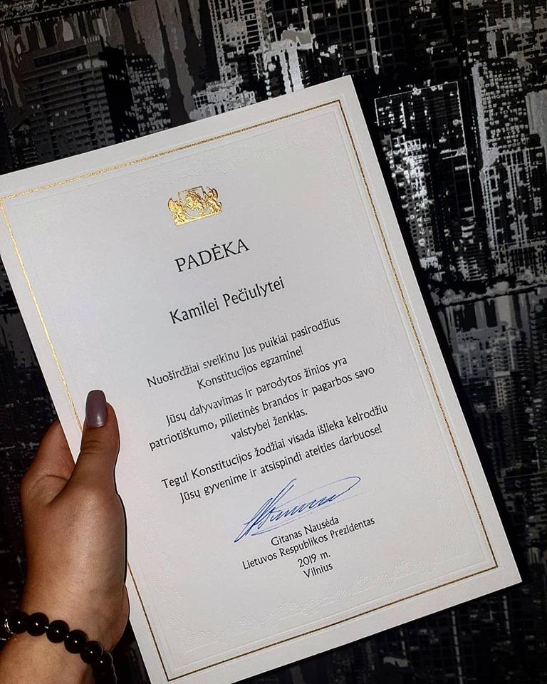 Gimnazistai kartu su juos ruošusiomis mokytojomis Salomėja Paškevičiene ir Audrone Pileckiene bei savo tėvais, šio egzamino koordinatore gimnazijos direktorės pavaduotoja Edita Pavasariene lankėsi Prezidentūroje, kur juos apdovanojo Prezidentas Gitanas Nausėda. Taip pat Prezidentūroje šioje ceremonijoje dalyvavo ir egzamine gerai pasirodęs Šeštokų mokyklos 2 klasės mokinys Vilius Burakovas ir jo mokytoja Irena Bernatonienė.