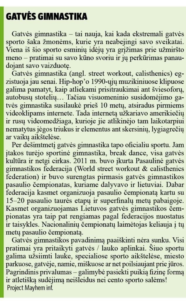 – Tai atletinis sportavimas, išnaudojant savo kūno svorį ir naudojantis įrankiais – lygiagretėmis ir įvairiais skersiniais. Šie įrankiai yra daugelio mokyklų stadionuose, kitose viešose vietose, todėl ši sporto šaka pavadinta gatvės gimnastika. Varžybos vyksta specialiose aikštelėse, tačiau treniruotis galima visur, kur yra šie įrankiai.