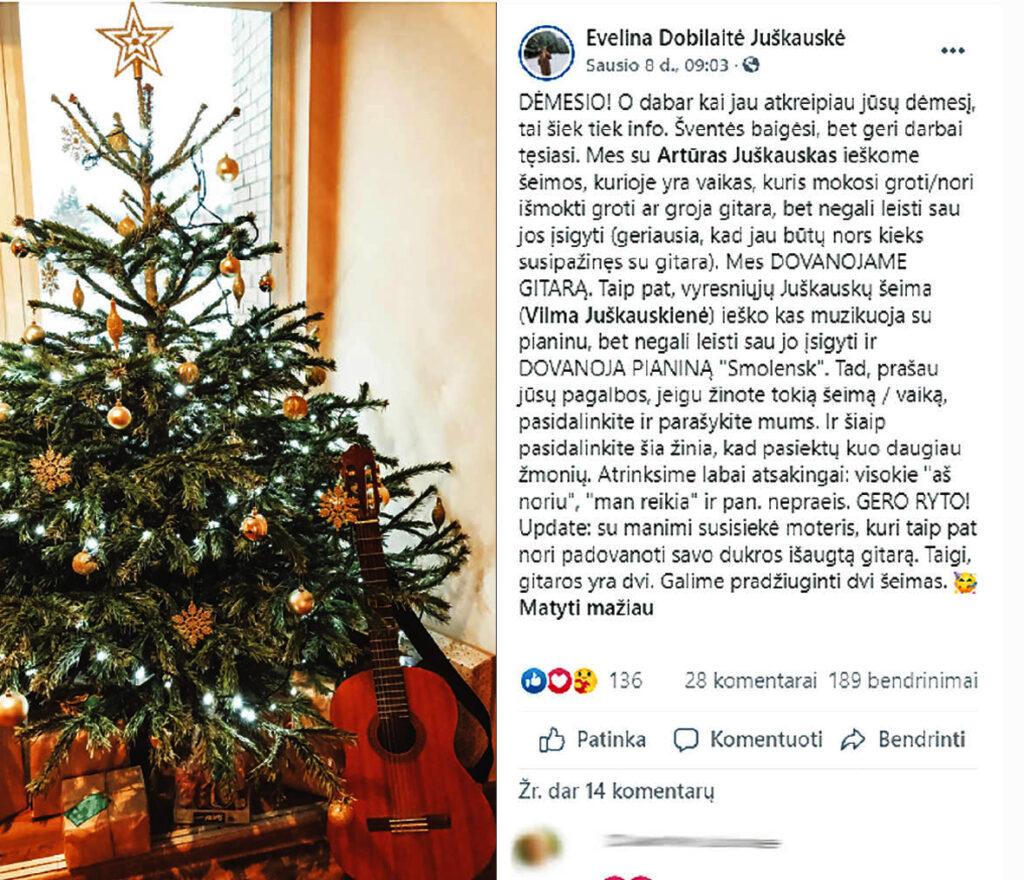 Lazdijietė Evelina Dobilaitė-Juškauskė su vyru Artūru nusprendė jaunam ir muzikuojančiam žmogui padovanoti gitarą, kuria ilgai ir sėkmingai grojo Artūras Juškauskas. Moteris socialiniuose tinkluose paskelbė, jog dovanos gitarą. Netrukus atsiliepė moteris iš Kauno, kuri sakė taip pat norinti dovanoti dukros „išaugtą“ gitarą, ir paprašė Evelinos pasirūpinti ir jos dovanojamu instrumentu.
