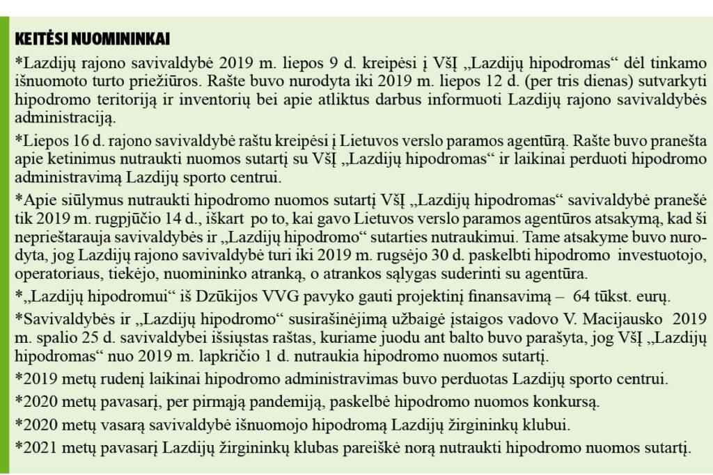 Tarybos narys Benius Rūtelionis pripažino, jog Lazdijų žirgininkai, sutikdami administruoti hipodromą, išgelbėjo savivaldybę nuo nemalonumų ir prievolės sugrąžinti projektinius pinigus. Jo nuomone, dabar problema yra ta, kad vietiniai žirgų entuziastai nesusišneka su vadinamuoju karališkuoju žirgininku Linu Balčiūnu.
