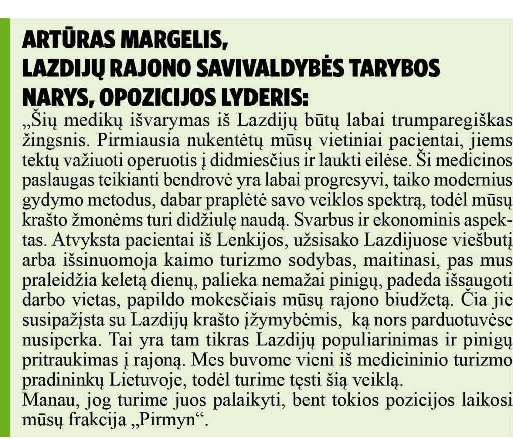 Keista, kad strateginį sprendimą – išsaugoti ar išvaryti perspektyvią medicinos paslaugas teikiančią bendrovę – priėmė ne patys politikai, bet saujelė ligoninės senbuvių. Privačios medicinos bendrovės vadovas kreipėsi į rajono savivaldybės tarybos narius, prašydamas suteikti galimybę ir toliau teikti medicinos paslaugas Lazdijų ligoninėje. Dabar tik nuo Lazdijų politikų sveiko proto priklausys, ar šios unikalios paslaugos liks mūsų krašte, ar iškeliaus į kitą savivaldybę.