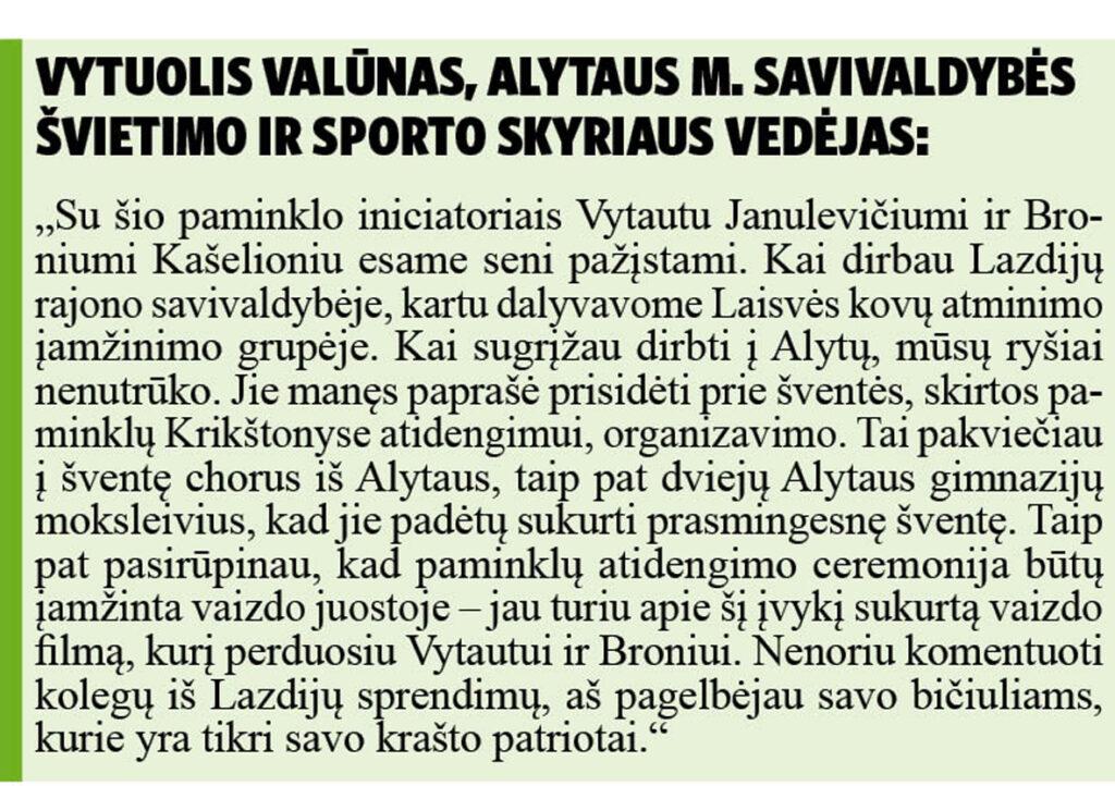 Vienas iš paminklo statytojų, B. Kašelionis, įsitikinęs, jog Lazdijų valdžia šventėje nedalyvavo dėl metų senumo konflikto su paminklo iniciatoriais.