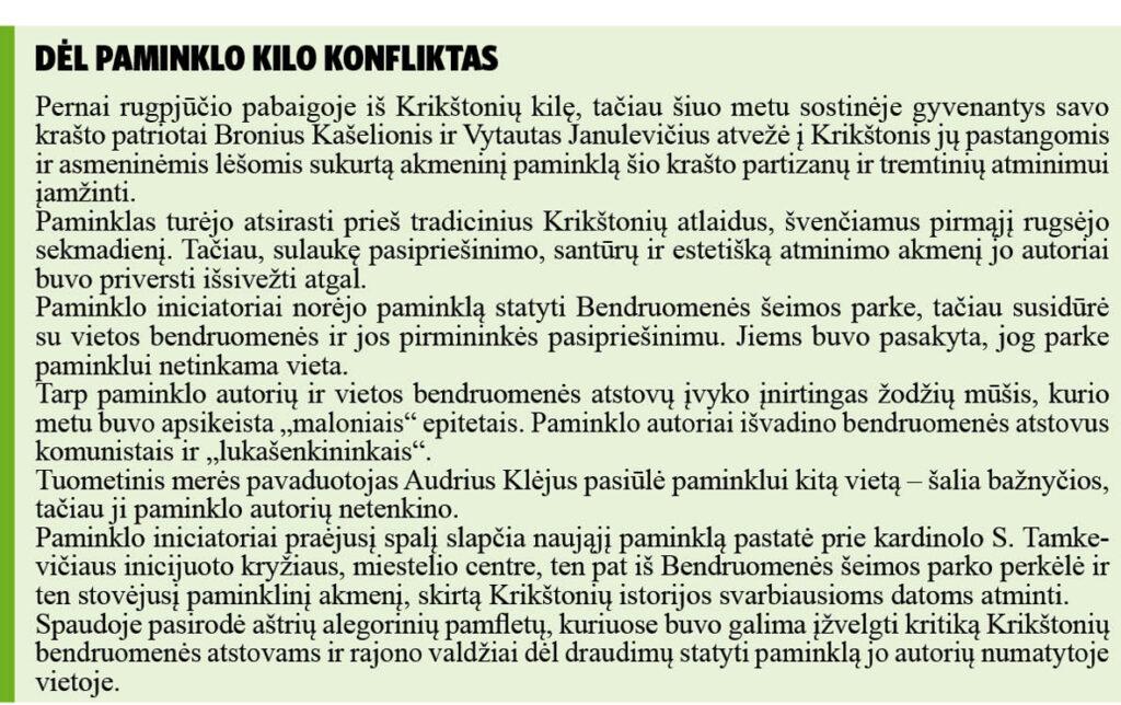Pašnekovas prisiminė, jog konfliktas dėl paminklų prasidėjo pernai, kai, anot jo, Krikštonių bendruomenės pirmininkė Lena Švetkauskienė „organizavo invaziją“. Tada į Krikštonis privažiavo valdžios atstovų, kurie nurodinėjo, kur paminklą statyti.