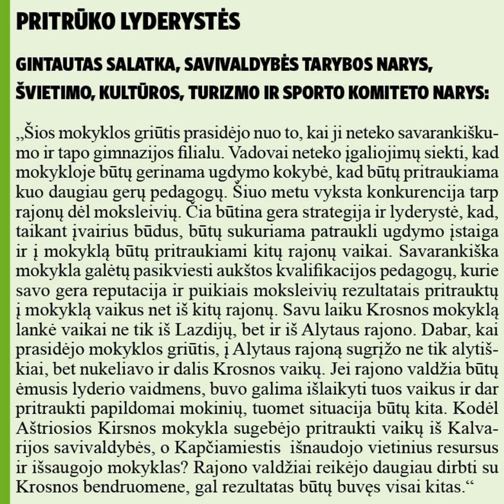 Tą patvirtino ir antradienį vykęs savivaldybės tarybos Švietimo, kultūros, turizmo ir sporto komiteto posėdis, kuriame buvo pritarta mokyklos uždarymui. Kodėl taip atsitiko? Kas kaltas dėl tokios situacijos? Ar buvo galima išsaugoti mokyklą? Vaikai su pinigų krepšeliais iškeliaus į Alytaus rajoną? Šie ir kiti klausimai kankina Krosnos mokyklos moksleivių tėvus, miestelio bendruomenę, tarybos narius. Kai kurių politikų nuomone, viena iš svarbiausių šios situacijos priežasčių – švietimo strategijos nebuvimas ir rajono vadovų lyderystės trūkumas.