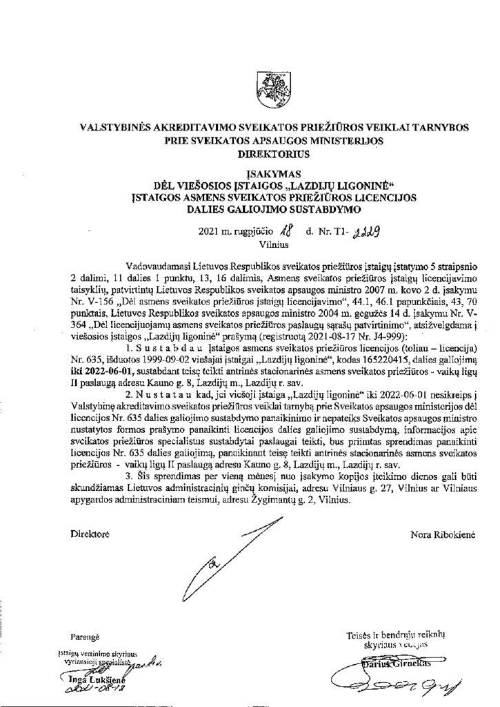 VASPVT direktoriaus įsakyme buvo nuostata, jog, jei Lazdijų ligoninė iki 2021-08-21 nesikreips į VASPVT dėl licencijos dalies galiojimo sustabdymo panaikinimo ir nepateiks sveikatos apsaugos ministro nustatytos formos prašymo panaikinti licencijos dalies galiojimo sustabdymą, taip pat informacijos apie sveikatos priežiūros specialistus sustabdytai paslaugai teikti, bus priimtas sprendimas panaikinti licencijos dalies galiojimą, panaikinant teisę teikti antrinės stacionarinės asmens priežiūros – vaikų ligų II paslaugą Lazdijų ligoninėje.
