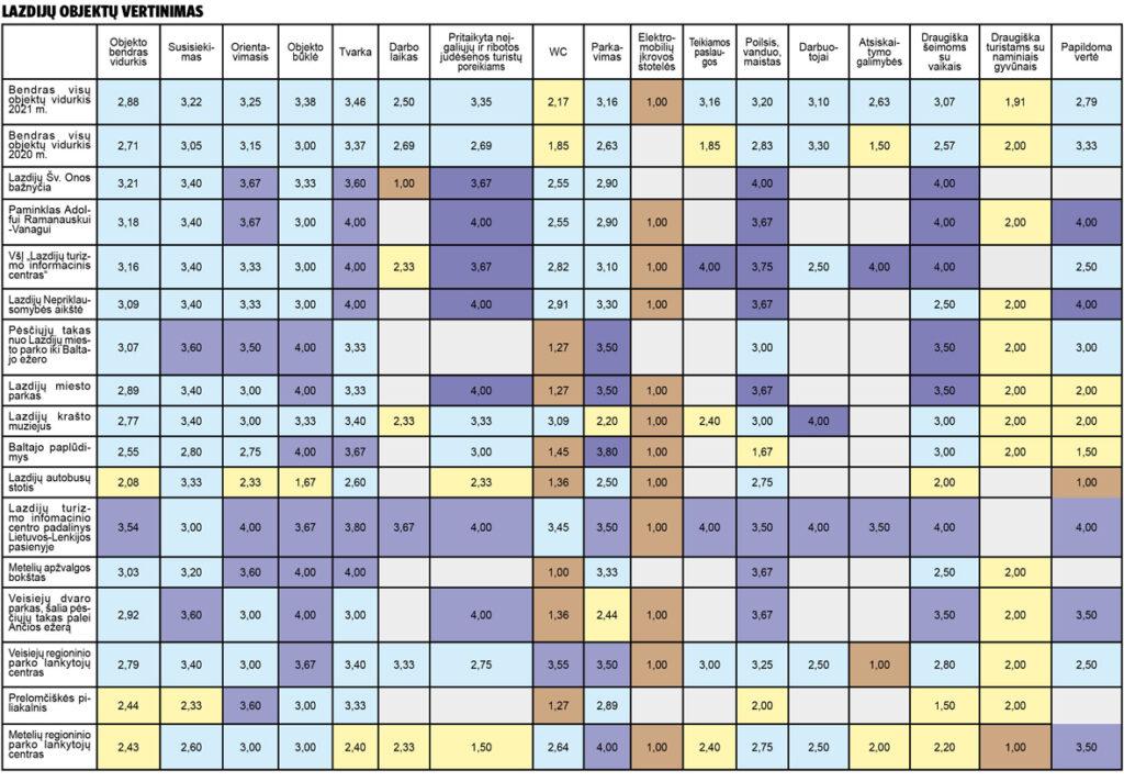 Lazdijų turizmo objektai įvertinti 2,88 balo (iš 4 galimų), šis vertinimas aukštesnis nei grupės (2,73) ir nacionalinis (2,78) vidurkiai.