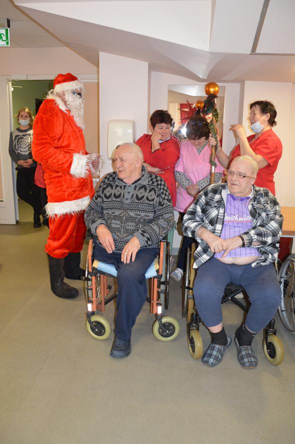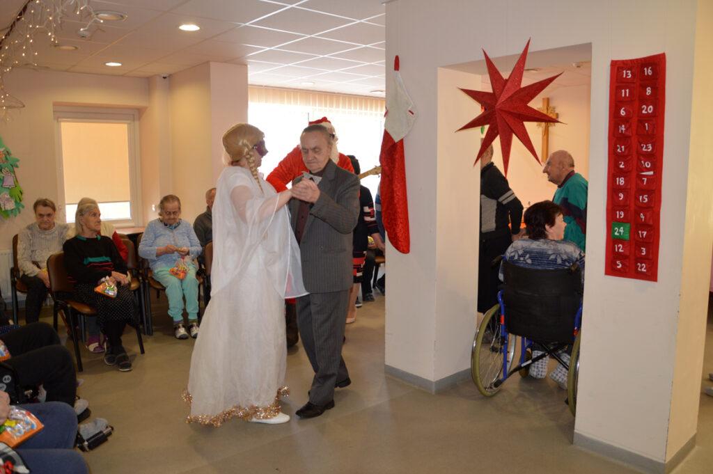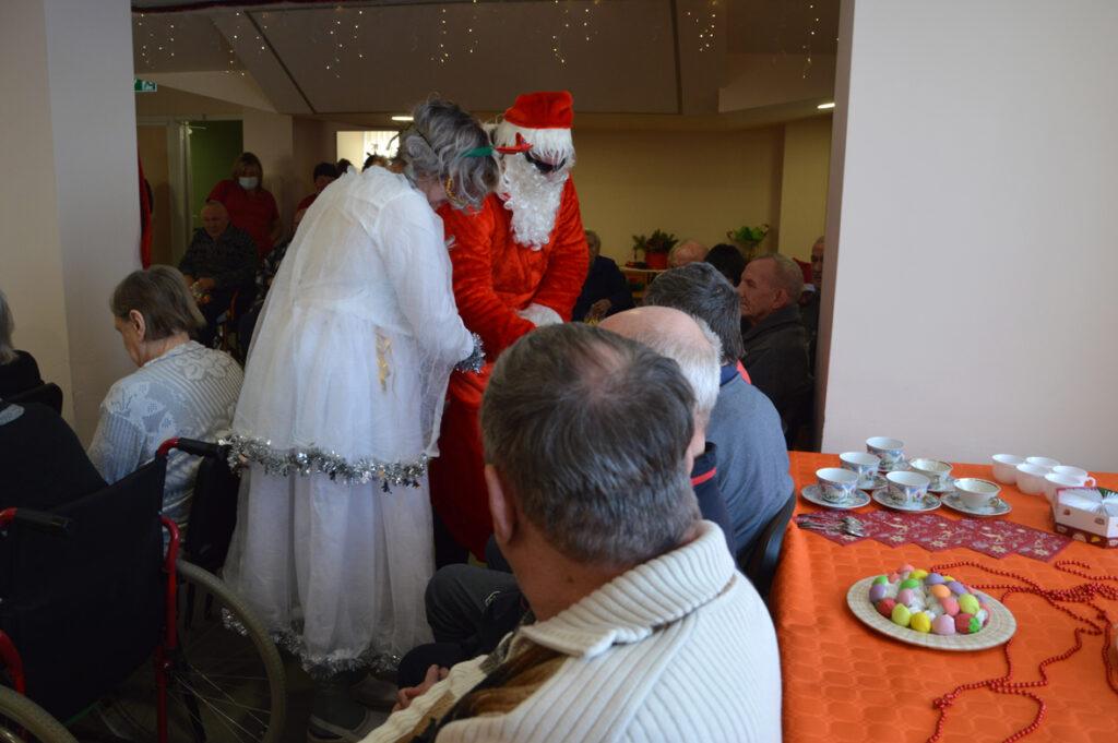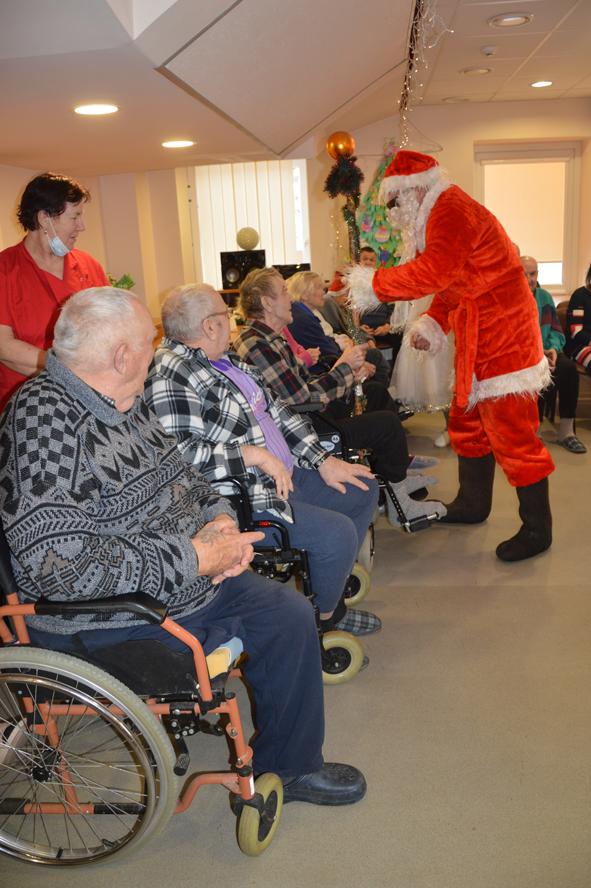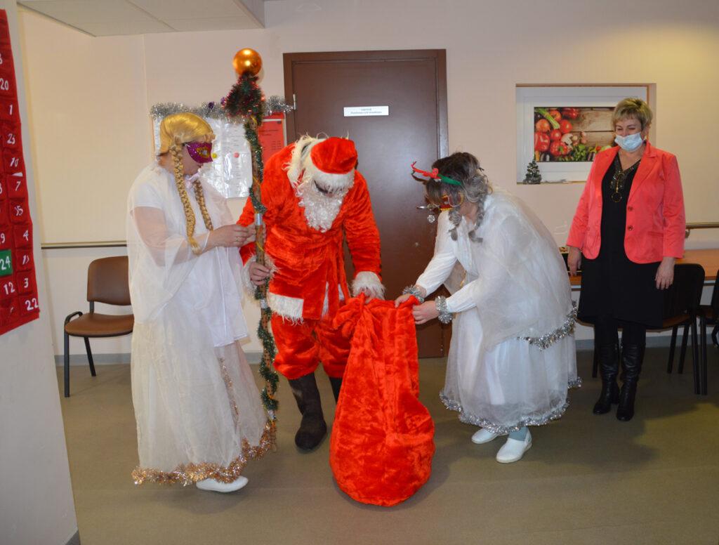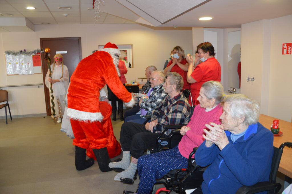 Šių namų gyventojai visada šiltai ir džiaugsmingai pasitinka juos aplankančius. Kalėdų Senelis stengėsi kiekvieną išklausyti, liepė stebuklingą lazdą palaikyti, kad išsakytas noras ar palinkėjimas tikrai išsipildytų, pašokdinti tie, kurie gali. Išsakyta daug gražių žodžių, palinkėjimų, eilėraščių. Smagiausia buvo matyti šypsenas ir džiaugsmą veiduose, norą pabendrauti. Juk Kalėdų Senelis ne tik su pilnu maišu saldėsiais kvepiančių ryšulėlių atvyko, bet ir pats gitarą į rankas paėmęs visus linksmino. Prisišokta, padainuota ir mįslės įmintos. O kas negalėjo ateiti kartu pasibūti, Kalėdų Senelis aplankė kambariuose, čia jis sutiktas ir su ašaromis, ir su šypsenomis. Vieni seneliai graudinosi, kiti džiaugėsi, delnuose laikė dovanas tarsi stebuklą, kad nepamiršti, kad svarbūs, reikalingi, kad ne vieni. „Aš jau seniai nežiūriu nei į pasą, nei veidrodį“, – juokavo Kalėdų Senelis girdamas senoles. Ir pats kaip tikras džentelmenas barzdą sau pasišukavo, pasitvarkė. Sakė nenorįs prastai atrodyti.