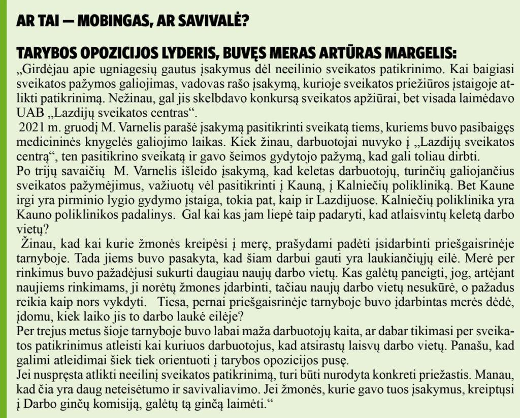 Nors pagal galiojančią tvarką darbdavys gali tik rekomenduoti gydymo įstaigą, o nenurodyti darbuotojui, kokioje konkrečioje gydymo įstaigoje tikrintis sveikatą. Maža to, M. Varnelis nusprendė už sveikatos patikrinimą apmokėti iš Lazdijų rajono savivaldybės biudžeto lėšų (jau dvigubai) ne tik UAB „Lazdijų sveikatos centras“, bet ir VšĮ Kauno miesto poliklinikos Darbo medicinos centrui, net kompensuoti kuro išlaidas vykstantiems į Kauną neeiliniam sveikatos patikrinimui.