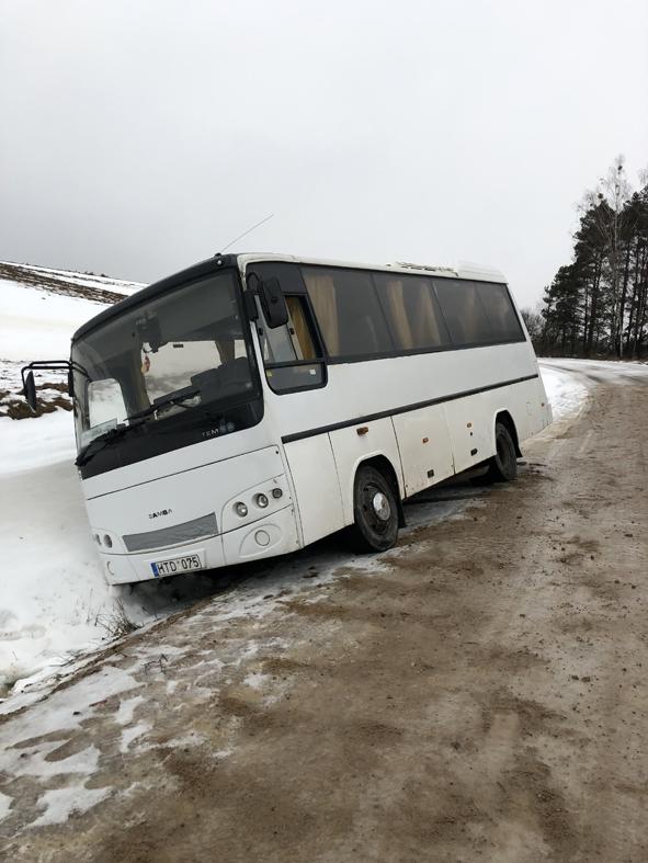 „Net stovėti ant ledu pasidengusios dangos buvo sunku“, – sako Lazdijų autobusų parko direktorius Ramūnas Masiulionis, kuris praėjusį ketvirtadienį (sausio 27 d.) atvyko prie įmonės autobuso, kai šis nuslydo nuo nebarstyto kelio Lazdijai–Kučiūnai–Veisiejai. Laimei, autobuse žmonių nebuvo. „Tai nėra populiarus maršrutas, – teigia transporto įmonės vadovas, – bet Lazdijų rajono savivaldybė prašo nenutraukti pavėžėjimo paslaugos, o keliu nesirūpina nei kelininkai, nei keleivius prašanti vežti Lazdijų savivaldybė.“ Anot Ramūno Masiulionio, vežti keleivius pavojinga: ,,Sėdime lyg ant parako statinės. Nežinai, ar vairuotojas grįš iš maršruto nepatekęs į avariją, ar ne“. Įmonės vadovas ne kartą nesėkmingai bandė susisiekti su kelininkais. Sausio 26 dieną vėl nepavyko, todėl nusprendė prašyti Lazdijų rajono savivaldybės, kad ši tarpininkautų, bet kelias taip ir liko nebarstytas, o ketvirtadienį ryte minėtos įmonės autobusas, važiuodamas nuo kalno, nuslydo į pakelės griovį. Po eismo įvykio pasirodė ir kelininkų barstytuvas. Kelio danga buvo itin slidi, tuo įsitikino ir kelininkai, kurių „Mercedes Benz“ irgi neišsilaikė ant važiuojamosios dalies ir galiniai ratai nuslydo į griovį. Vežėjo paslaugas teikiantis Lazdijų autobusų parkas prašo kelininkų barstyti bent pačias pavojingiausias vietas – įkalnes, bet kelininkai atrėžia, kad visi keliai turi savo kategorijas, esą pagal jas ir valomi.