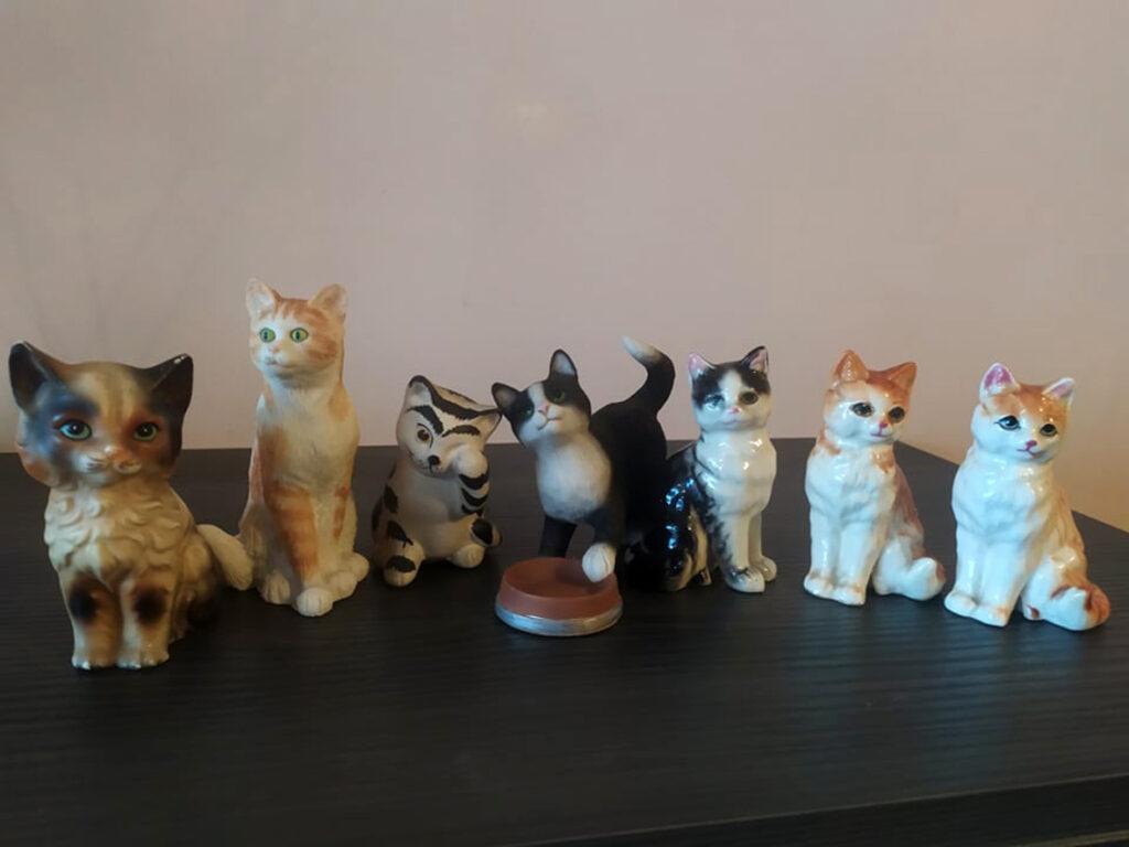 Pliušinių katinukų nerenka. Jos katinai iš porceliano, stiklo, keramikos, medžio, metalo, bet ne pliušiniai, kurie rinktų dulkes, tikrai ne. „Keletą turėjau ir pliušinių, atidaviau žaisti savo augintiniams – katinukams“, – tarsteli Rasa. Katinukai: lėkštutės, puodeliai, suvenyrai, pakabukai ir net skėtis su katinais. Kai ką ji naudojanti ir buityje.