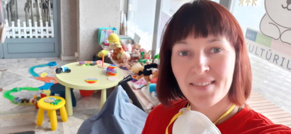 „Ten mūsų atsakomybė – rūpintis iš Ukrainos atvykusiais vaikais, mamomis su kūdikiais, besilaukiančiomis moterimis. Tuo metu, kai tėvai tvarko dokumentus, vaikai nuobodžiauja, tai mes su jais užsiimame. Kviečiame juos į žaidimų kambarius, ten žaidžiame su jais, pabendraujame, taip pat užtikriname jų saugumą. Mamos ir vaiko kampelyje padedame mamoms vaikus pervystyti, duodame sauskelnių, jei jų neturi“, – pasakojo Kristina.