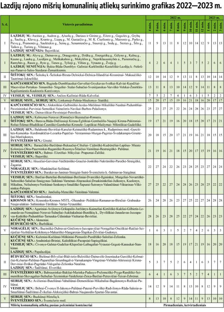 Lazdijų rajono mišrių komunalinių atliekų surinkimo grafikas 2022–2023 m.
