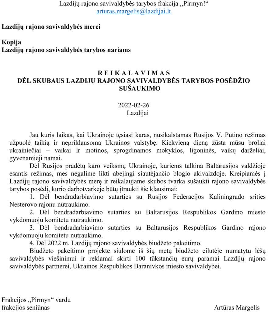 Opozicijos lyderis Artūras Margelis teigė, kad frakcija „Pirmyn!“ nusprendė, jog reikia atšaukti partnerystės sutartis su šalių agresorių – Rusijos ir Baltarusijos – savivaldybėmis: su Kaliningrado srities Nesterovo miestu, taip pat su Baltarusijos Gardino miesto ir Gardino rajono vykdomaisiais komitetais.