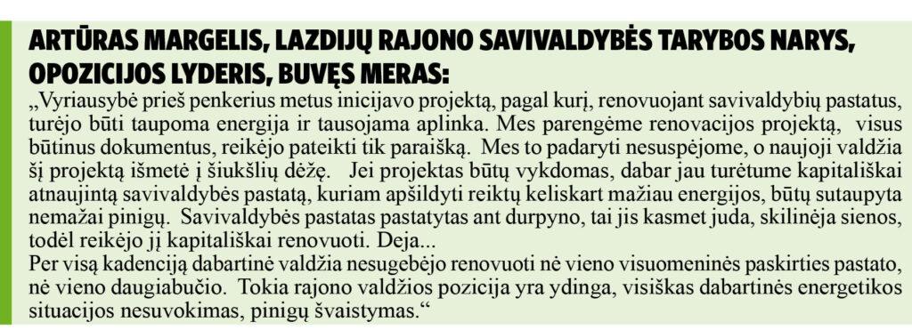 Tačiau dabartinė rajono valdžia, panašu, vadovaujasi principu: „Ką sugalvojo buvusioji valdžia, viską reikia mesti į šiukšlių dėžę.“ Taip atsitiko su sporto centro projektu, tas pats likimas ištiko ir savivaldybės pastato renovacijos projektą bei dar daugiau anksčiau parengtų Lazdijams naudingų projektų.