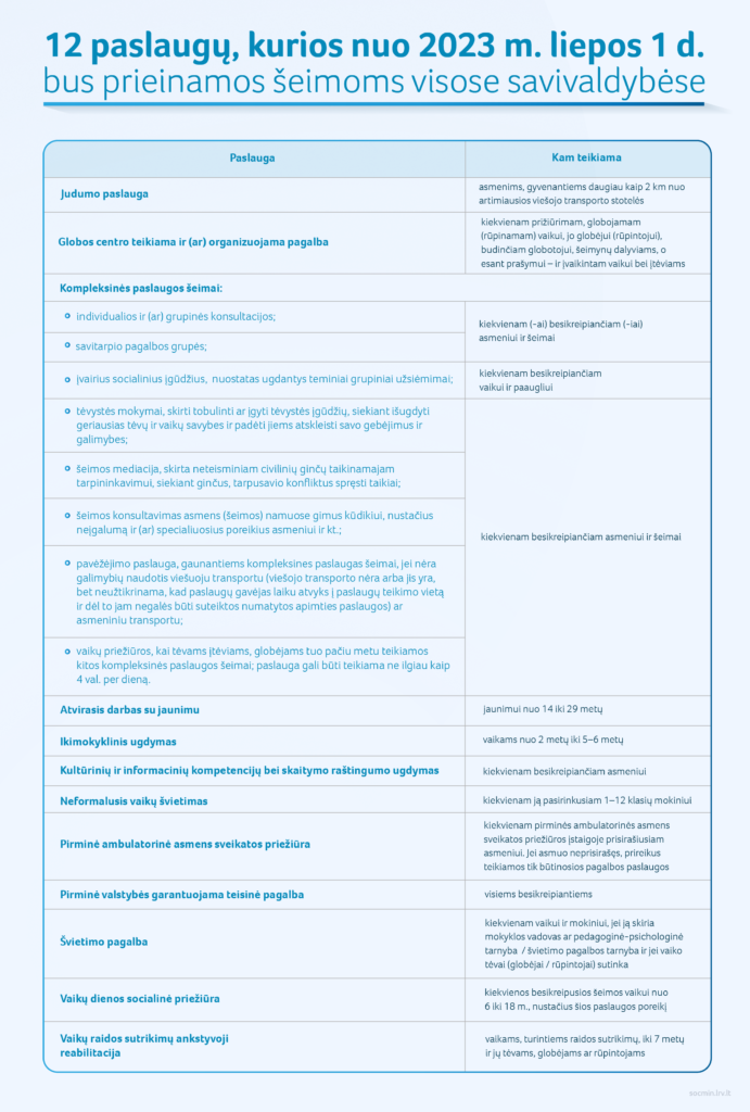 „Siekiame, kad pagrindinės ir būtiniausios paslaugos būtų prieinamos visiems šalies gyventojams, kad šeimoms būtų sudarytos sąlygos jomis pasinaudoti, kad ir kur jos gyventų – mieste ar kaime. Nuo šiol išplečiamas šeimai teikiamų paslaugų ratas. Siekiant spręsti susisiekimo problemas savivaldybėse, planuojama plėtoti judumo paslaugą. Nuošaliau gyvenančioms šeimoms savivaldybės galės sudaryti sąlygas gauti būtinas paslaugas“, – teigė socialinės apsaugos ir darbo ministrė Monika Navickienė.
