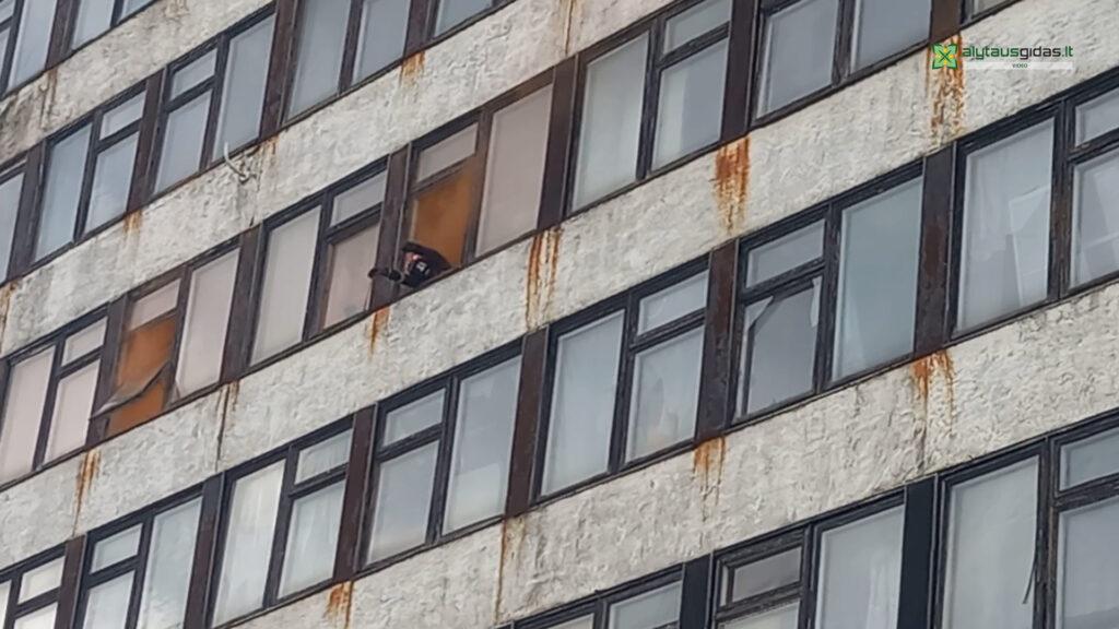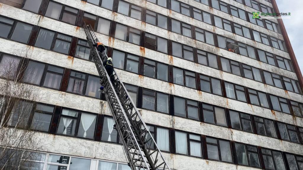 ,,Pagal scenarijų šeštajame aukšte buvo padegta laiptinė, ugnis išplito visame koridoriuje. Žmonės, negalėdami išeiti į lauką, pro langus prašė pagalbos. Vienas, neiškentęs karščio, iššoko pro langą. Laimei, ugniagesiai buvo paruošę oro pagalvę. Na, tokie gaisrai gyvenamajame sektoriuje kyla retai, bet kai jie kyla, būna labai skaudūs, todėl stengiamės situacijas atidirbti pratybose“, – sakė pratybų organizatorius Modestas Kazlauskas.
