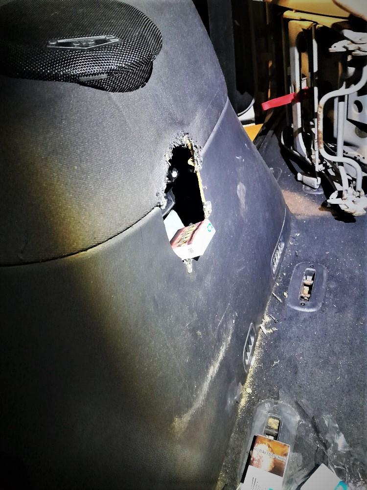 Išsamios patikros metu VSAT pareigūnams įtartina pasirodė „VW Sharan“ bagažinė. Nuo jos apdailos nuėmę garsiakalbį pasieniečiai aptiko, kad toliau ertmėje yra prikišta kontrabandos. Ten buvo 150 pakelių cigarečių „Minsk Capital QS“ be akcizo ženklų.