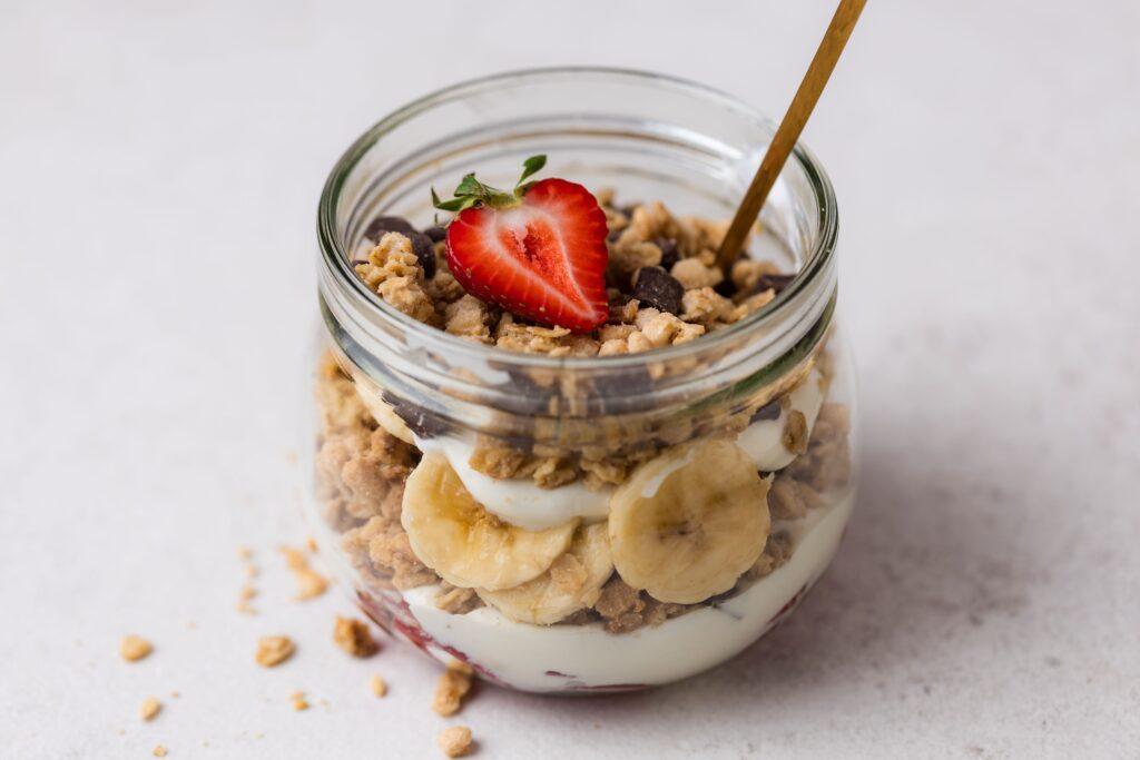 Granola su graikišku jogurtu, bananais ir braškėmis
