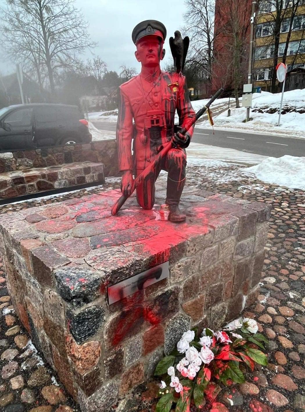 Merkinėje pirmadienį raudonais dažais aplietas partizanų vadui Adolfui Ramanauskui-Vanagui skirtas paminklas.