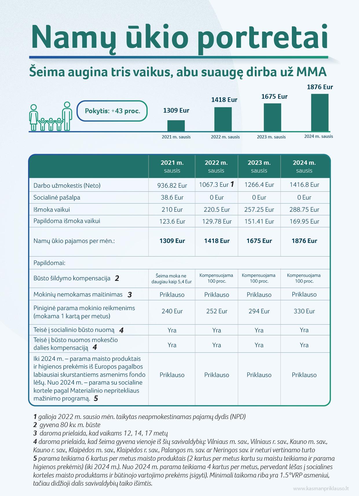 Šeima, auginanti tris vaikus, kai abu suaugę gauna MMA. 2024 m. tokia šeima gaus 12 proc. didesnes pajamas, kurios sieks apie 1876 eurus ir tai yra 200 eurų daugiau. Pajamos didėja dėl augančio darbo užmokesčio į rankas ir dėl didėjančių vaiko pinigų. Iš viso tokios šeimos pajamos per trejus metus nuo 2021 m. didėja 43 proc. Be to, namų ūkis turi teisę į būsto šildymo išlaidų kompensaciją, nemokamą mokinių maitinimą, piniginę paramą mokinio reikmenims, socialinį būstą ar būsto nuomos mokesčio dalies kompensaciją, paramą produktais ir prekėmis, atsiskaitant su socialine kortele iš Materialinio nepritekliaus mažinimo programos lėšų. Gyvendama 70 kv. m. būste, tokia šeima gautų 100 proc. būsto šildymo išlaidų kompensaciją.