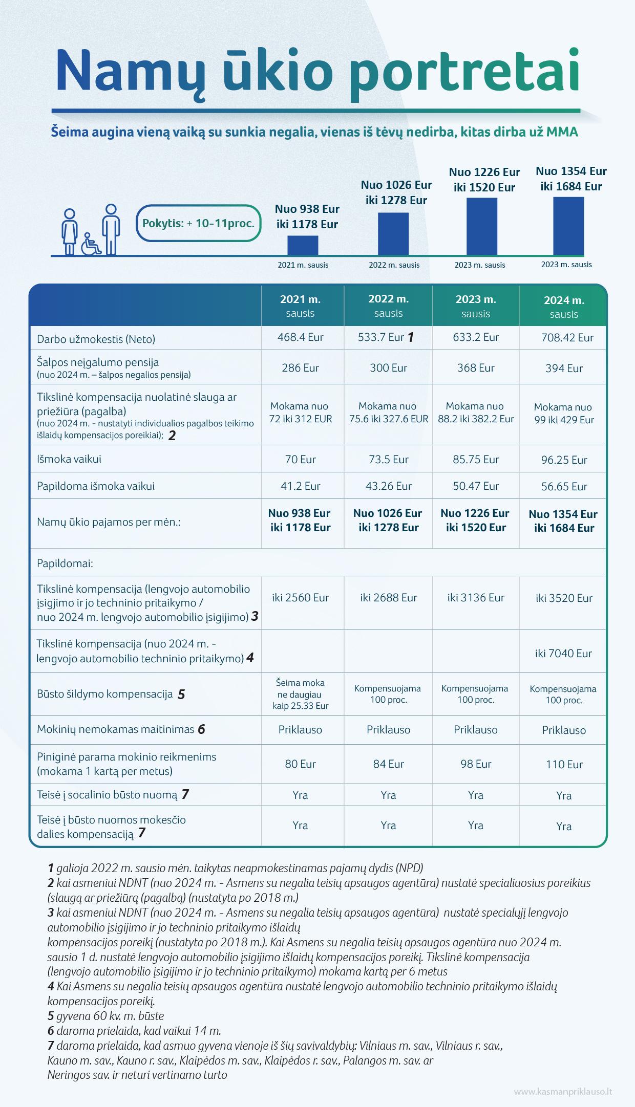 Šeima, auginanti vieną vaiką su sunkia negalia, kai vienas iš tėvų nedirba, o kitas gauna MMA. Tokios šeimos pajamos 2024 m. siekia 1354 – 1684 eurus. Palyginti, pernai sausį buvo 1226 – 1520 eurų. Be MMA šeima gaus 394 eurų dydžio šalpos negalios pensiją. Jei vaikui nustatytas individualios pagalbos teikimo išlaidų kompensacijos poreikis (iki 2023 m. gruodžio 31 d. specialusis poreikis) – pajamas atitinkamai padidins tikslinė kompensacija, kurios dydis – nuo 99 iki 429 eurų. Pajamas taip pat didins vaiko pinigai – apie 153 eurus.