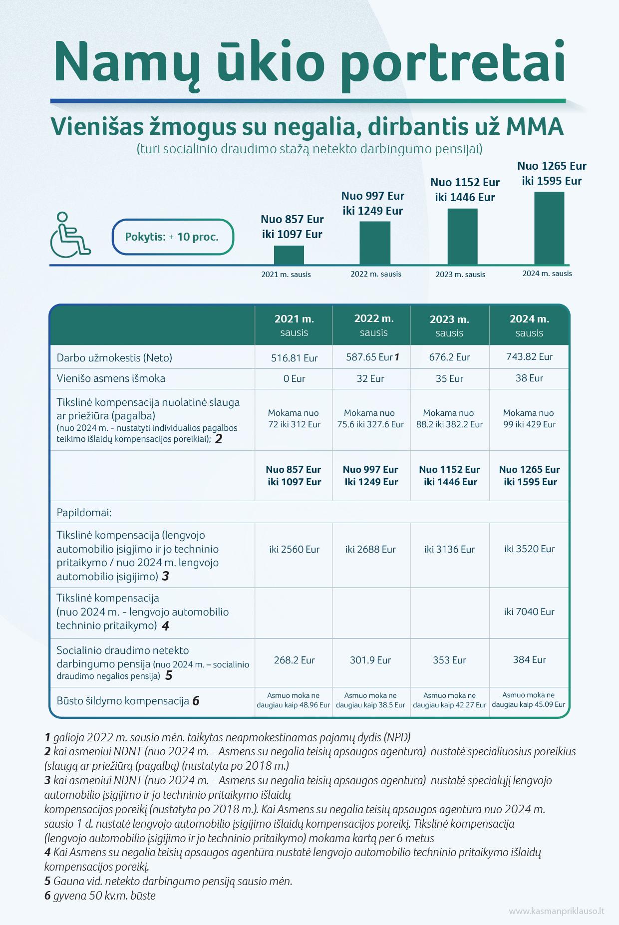 Vienišas žmogus su negalia, dirbantis už MMA (turintis socialinio draudimo stažą netekto darbingumo pensijai). Jo pajamos 2024 m. siekia 1265 – 1595 eurus. Palyginti, praėjusiais metais pajamos buvo 1152 – 1446 eurai. Be minimalaus darbo užmokesčio, jis turi teisę į vienišo asmens išmoką, netekto darbingumo pensiją (nuo 2024 m. – socialinio draudimo negalios pensija). Jeigu žmogui Asmens su negalia teisių apsaugos agentūra (Agentūra) (iki 2023 m. gruodžio 31 d. Neįgalumo ir darbingumo nustatymo tarnyba) yra nustačiusi individualios pagalbos teikimo išlaidų kompensacijos poreikį (iki 2023 m. gruodžio 31 d. – specialiuosius poreikius), jis turi teisę į tikslinę kompensaciją. Jei asmeniui Agentūra nustatė specialųjį lengvojo automobilio įsigijimo išlaidų kompensacijos poreikį, šios kompensacijos dydis 2024 m. siekia iki 3520 eurų. Jei Agentūra nustatė specialiųjų lengvojo automobilio techninio pritaikymo išlaidų kompensacijos poreikį, šios kompensacijos dydis siekia iki 7040 eurų.
