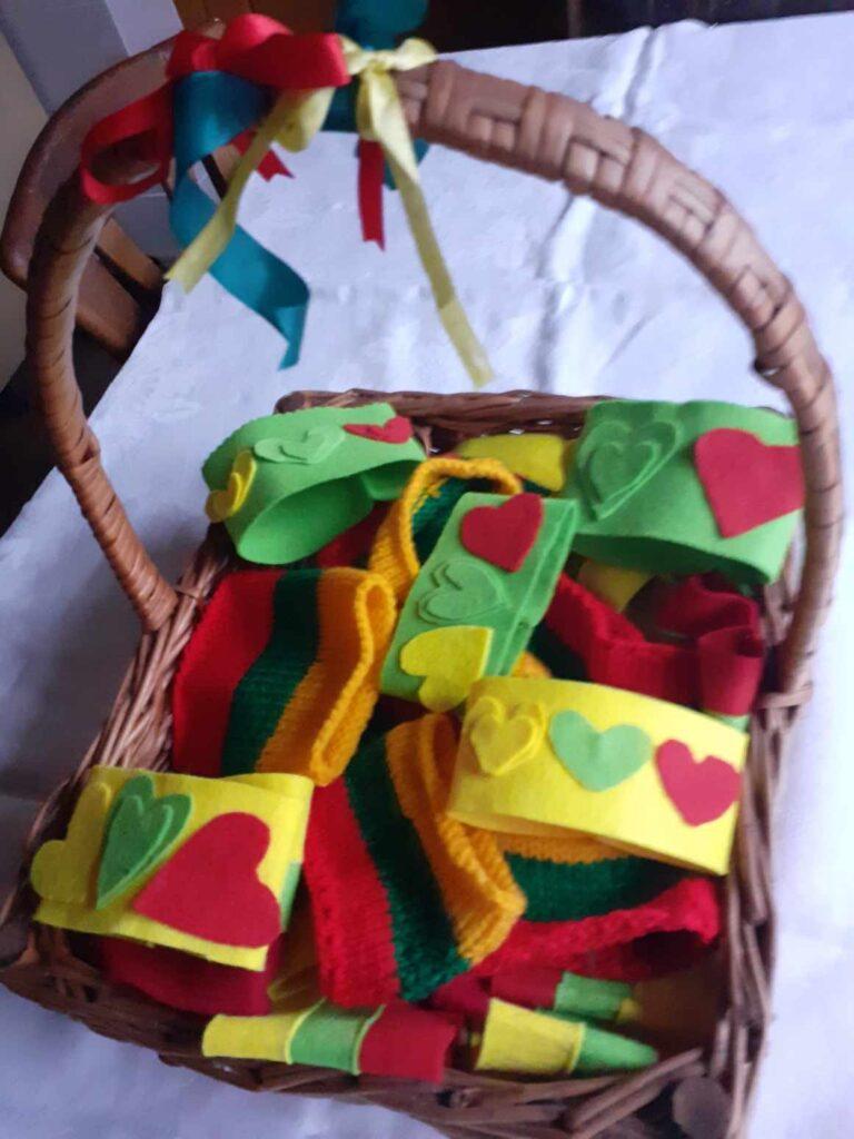 Darbo yra, jis dirbamas – tą ne kartą įrodė Veisiejų parapijos „Carito“ savanorės. „Sugrįžtuvių proga sugalvojome padaryti malonią staigmeną, kad ir kitiems būtų smagu“, – prasitaria ji. Šįkart Vasario 16-ajai, Lietuvos valstybės atkūrimo dienai, paminėti „Carito“ savanorės nusprendė savo rankomis numegzti, pasiūti trispalves riešines, kurias dovanos ateisiantiems į Veisiejuose organizuojamą iškilmingą minėjimą, skirtą Vasario 16-ajai. Vienas riešines mezgė, kitas siuvo iš specialios medžiagos – filco: puošė širdelėmis. Tikisi, kad tokios riešinės su lietuviška atributika pradžiugins minėjimo dalyvius. „Iš flico riešinės pasiuvamos, palyginus, greitai, širdeles dar suklijavome, o mezgėme ir namuose. Kai kuriuos darbus dirbome ir namie“, – pasakoja ji.