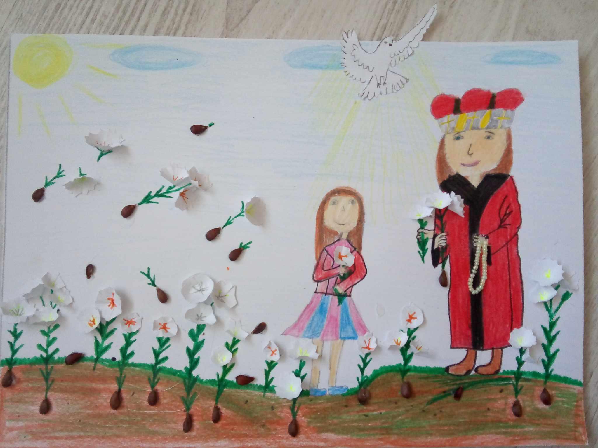 „Šiemet Austėja nupiešė Kazimierą ir save, kartu sodinančius lelijas, kaip skaistumo simbolius, panaudojant obuolių sėklas ir išlankstant žiedus, o Kotryna nupiešė karūną tarp daug žiedų. Savo piešiniu norėdama pasakyti, kad ją moko grožio“, – apibūdina dukrų piešinius mama.