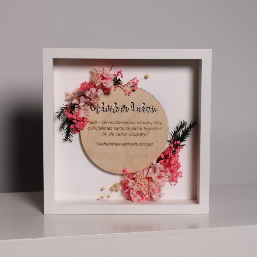 – Kaip jau minėjau anksčiau, daug medžiagos – augalų renku pati iš mūsų laukų. Kitą dalį perku iš ūkininkų ar gėlininkų. Įkvėpimą dažniausiai randu tokioje sintezėje – nuotraukoje ir poreikyje, ko reikia klientams. Man atrodo, kad mano produktas mane ir įrėmina, ir išlaisvina. Aš turiu labai ribotą pasirinkimą rėmelių, nes noriu, kad rėmelis būtų gilus, kad jo viduje virtų „gyvas” gamtos gyvenimas. Tad visą laiką ieškau būdų, kaip kitaip sudėlioti augalus, kaip dar kitaip juos atskleisti ir padaryti mini pievų laukelį, miškelį, kaip gražiai viską sukomponuoti. Tad visada stengiuosi apgalvoti įvairias naujas formas. Žinoma, žiūriu kitų kūrėjų pavyzdžius, kartais koks fragmentas įstringa, tada bandau jį perkelti ir pagražinti bei pritaikyti savo kūryboje. Be to, labai svarbu, kokius augalus turiu, nes kartais gali įsivaizduoti vienaip, o realybė kartais kitokia būna. Stengiuosi pasižiūrėti vis kokių įdomesnių, neišbandytų džiovintų ir stabilizuotų augalų. Būna, kad nusiperku, panaudoju, tačiau netinka ar ilgis, ar augalo struktūra, ar nesižiūri. Viskas vyksta bandymo būdu. Savo darbuose norėčiau atskleisti dar daugiau gamtos spalvinio natūralumo, nes mūsų lietuviškoje gamtoje nėra labai daug ryškumo. Tačiau žmonės dažniau renkasi ryškesnes spalvas. Matyt, jose daugiau šventiškumo. O galbūt esmė yra pateikimas – nuotrauka, iš kurios renkasi žmonės.