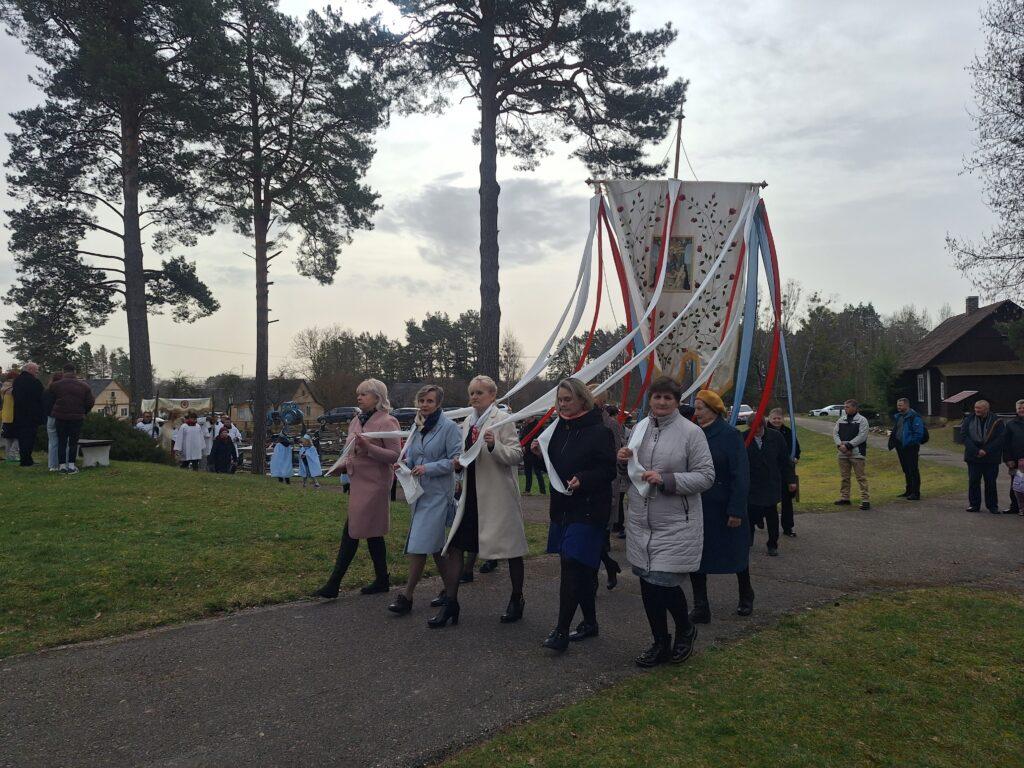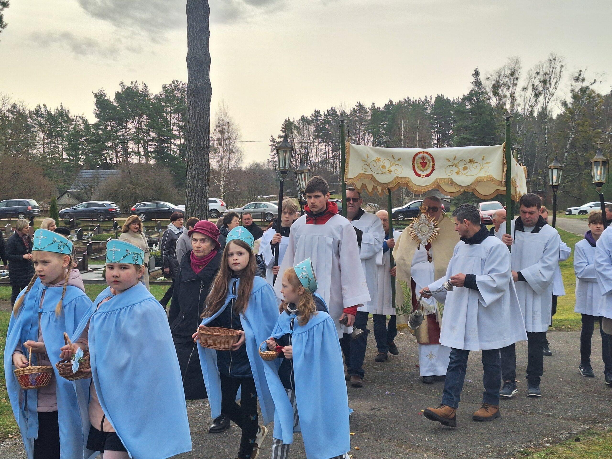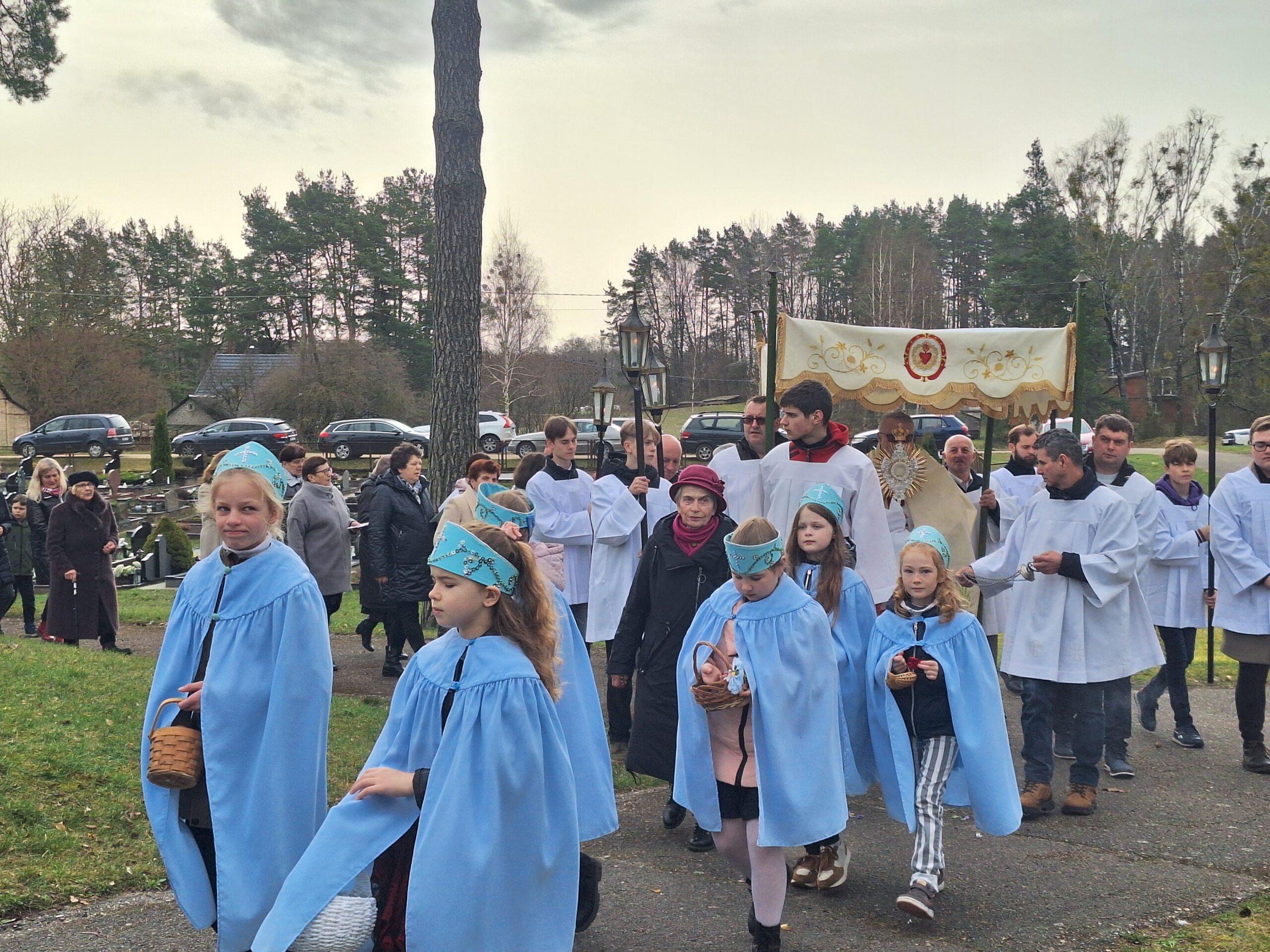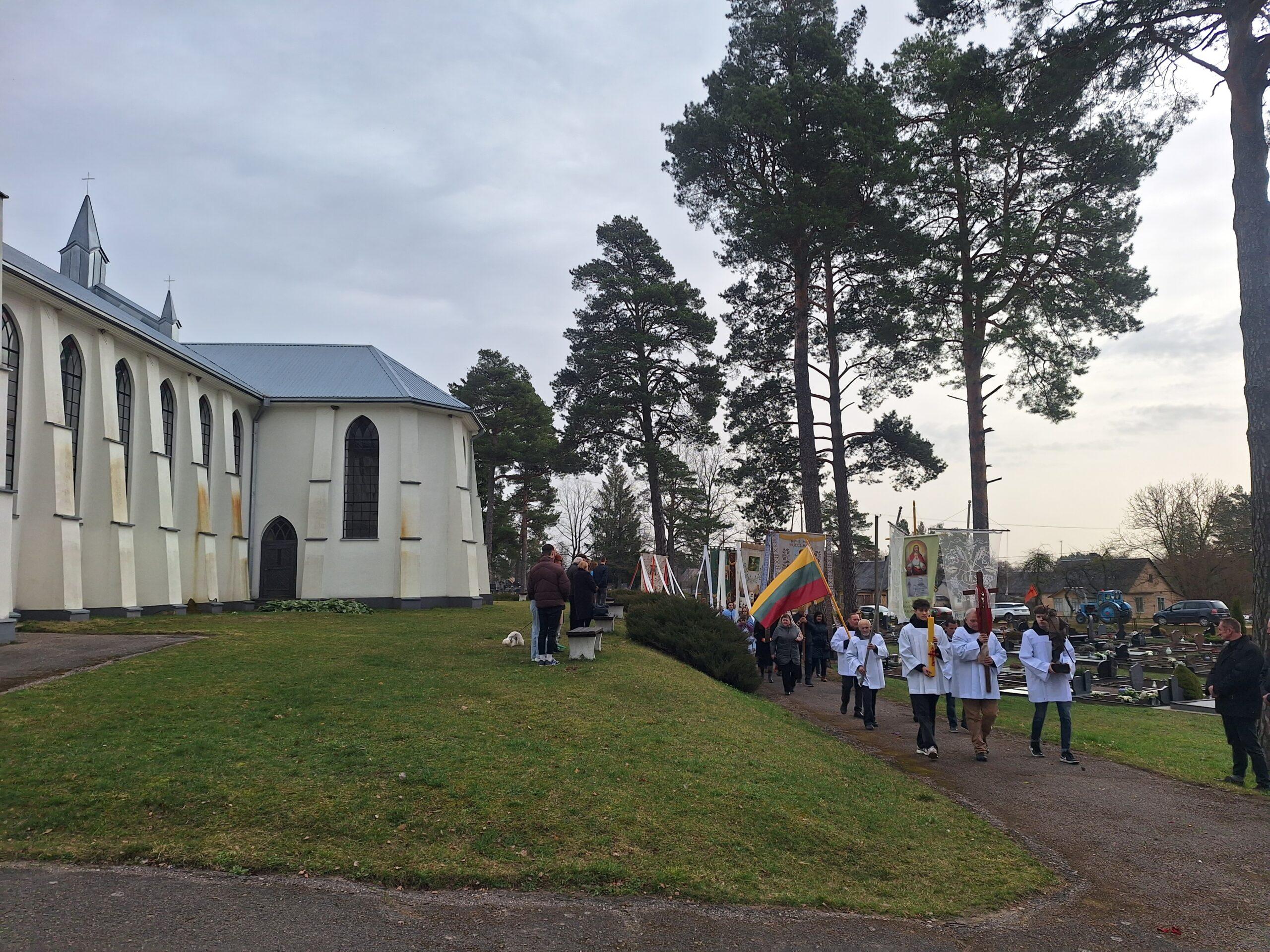Susirinkusius maloniai nustebino bažnytinė procesija, kurioje dalyvavo per penkias dešimtis parapijiečių. Tris kartus aplink bažnyčią keliavusioje procesijoje buvo nešamos bažnytinės vėliavos, kita bažnytinė atributika, pagal seną tradiciją po procesijoje einančio klebono kojomis buvo barstomi pavasarinių gėlių žiedai, giedojo bažnyčios choras.