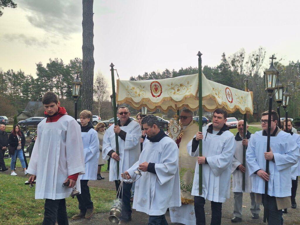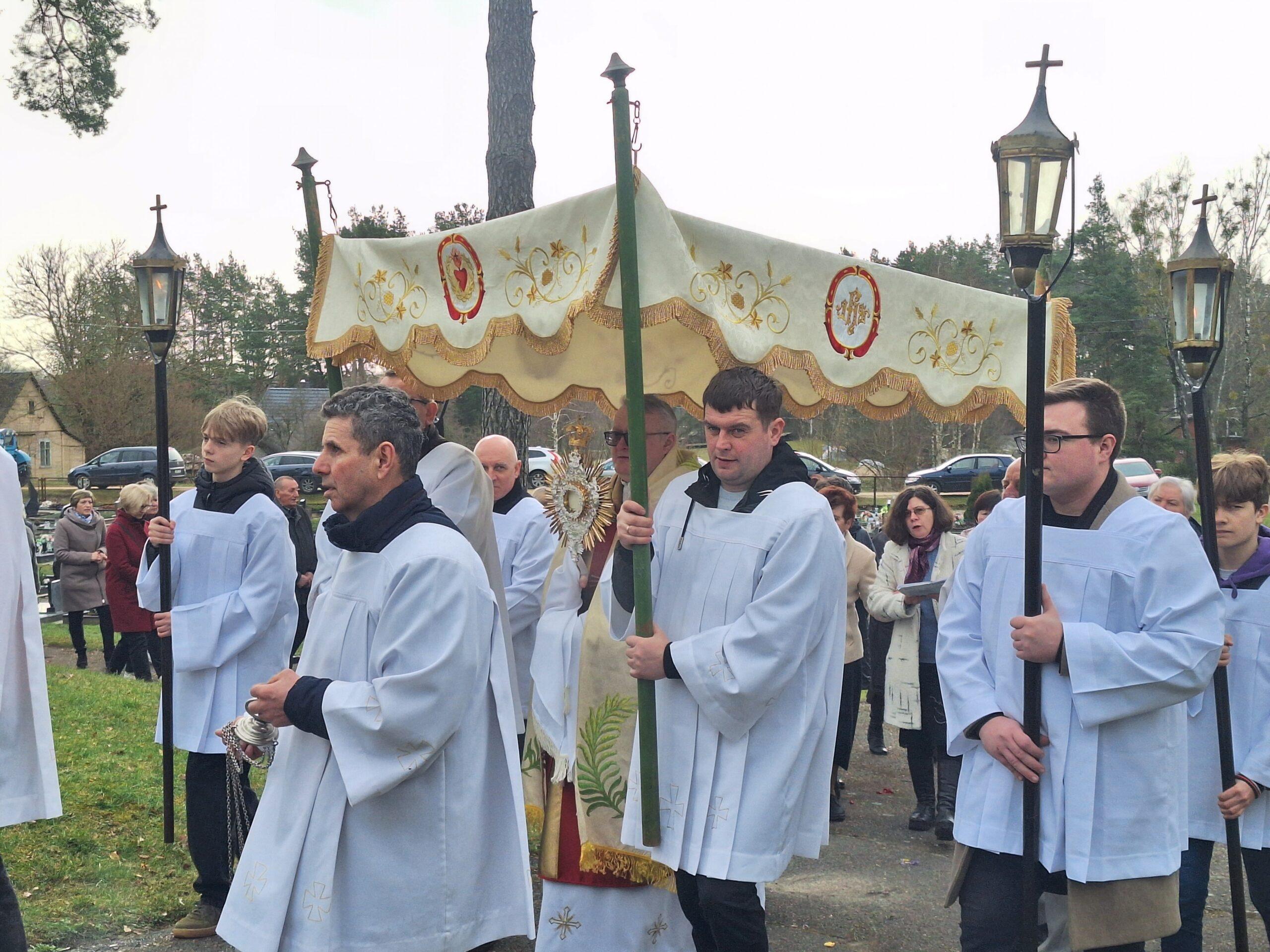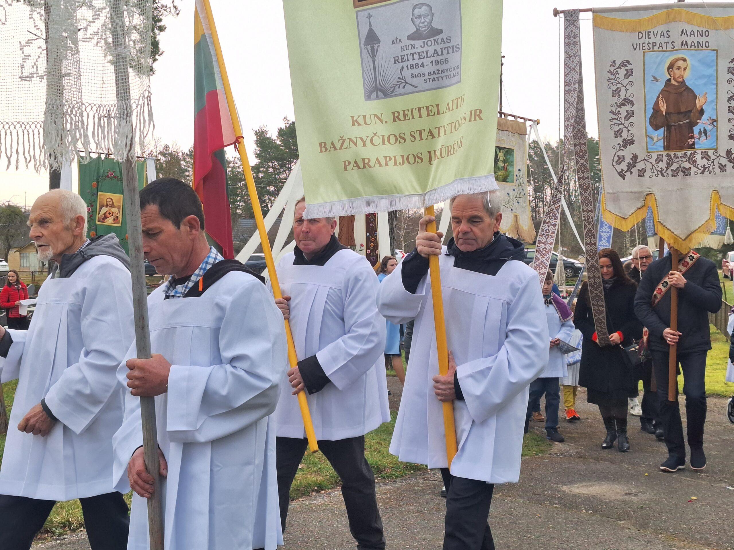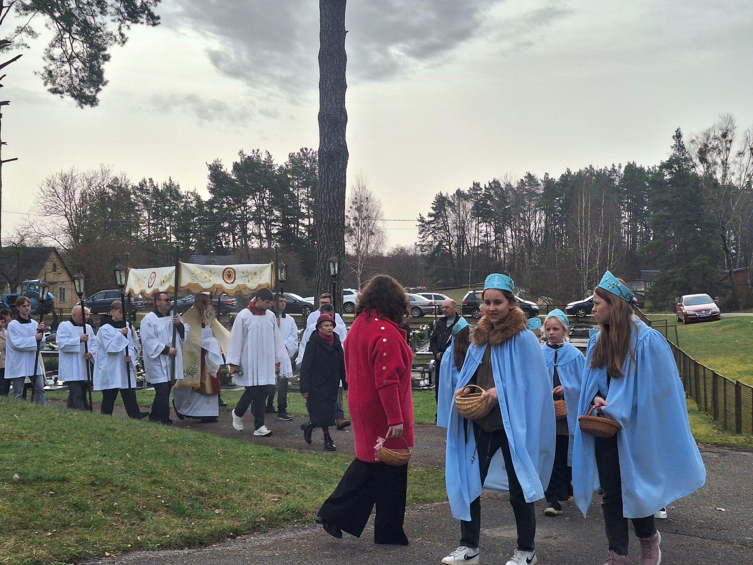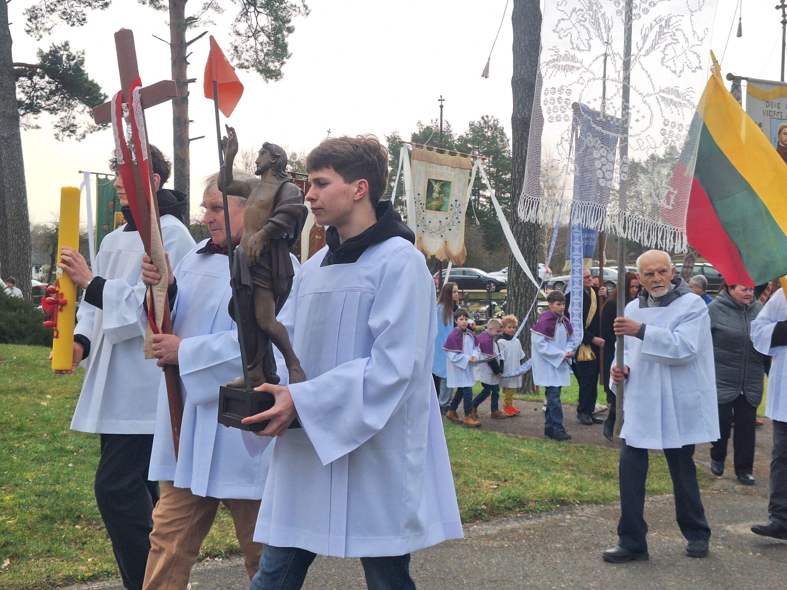 Susirinkusius maloniai nustebino bažnytinė procesija, kurioje dalyvavo per penkias dešimtis parapijiečių. Tris kartus aplink bažnyčią keliavusioje procesijoje buvo nešamos bažnytinės vėliavos, kita bažnytinė atributika, pagal seną tradiciją po procesijoje einančio klebono kojomis buvo barstomi pavasarinių gėlių žiedai, giedojo bažnyčios choras.