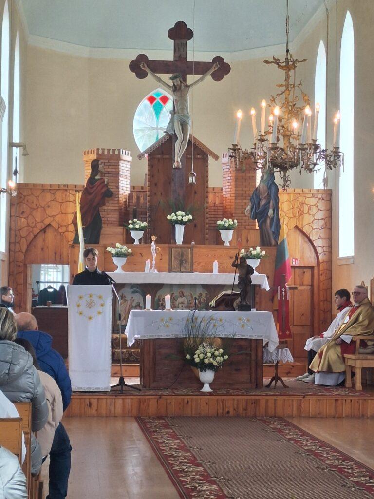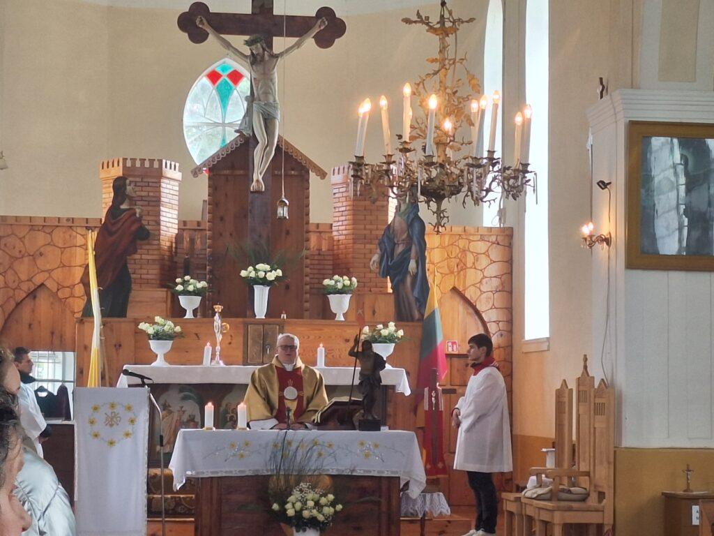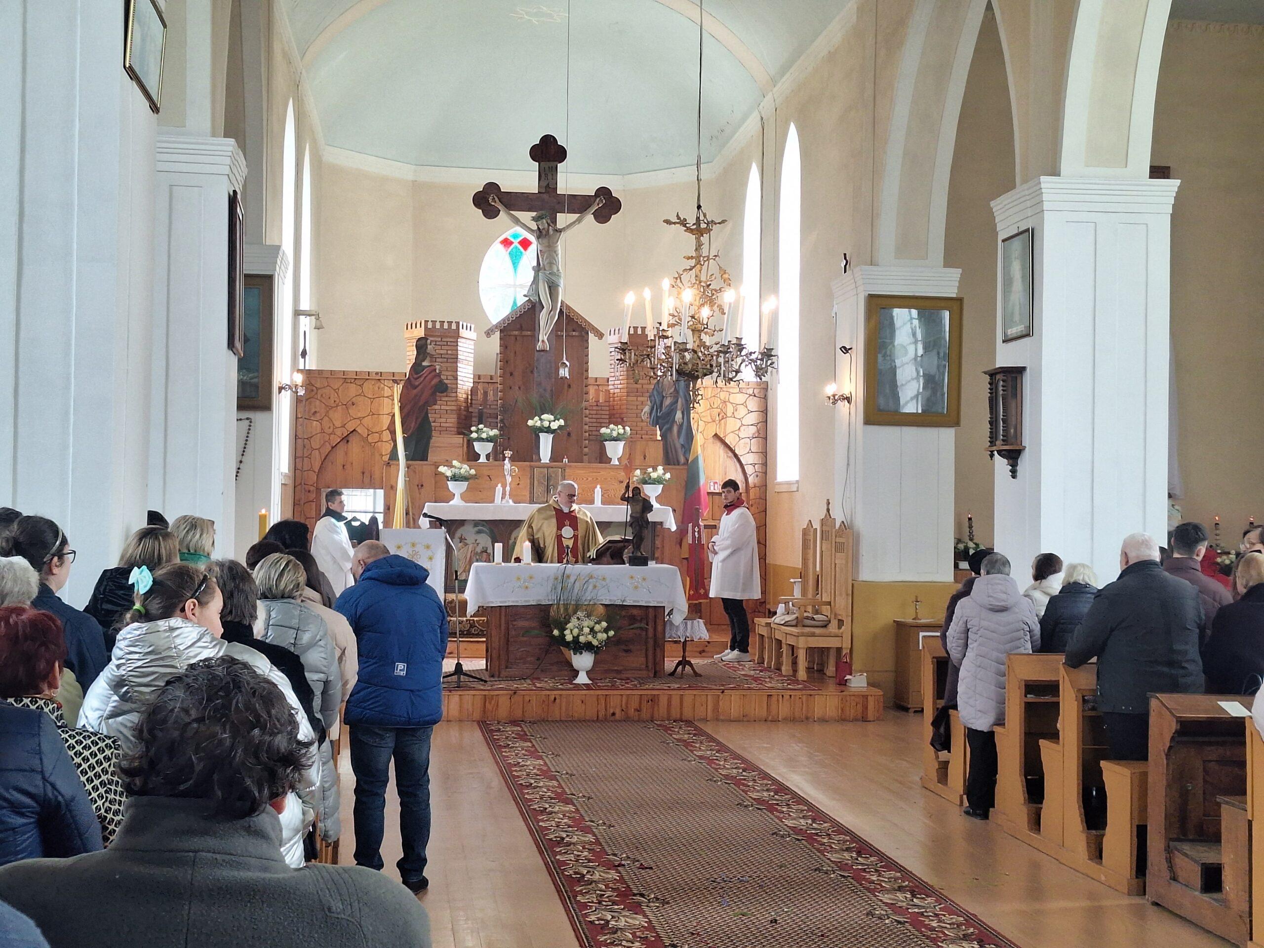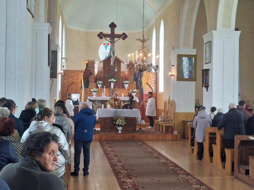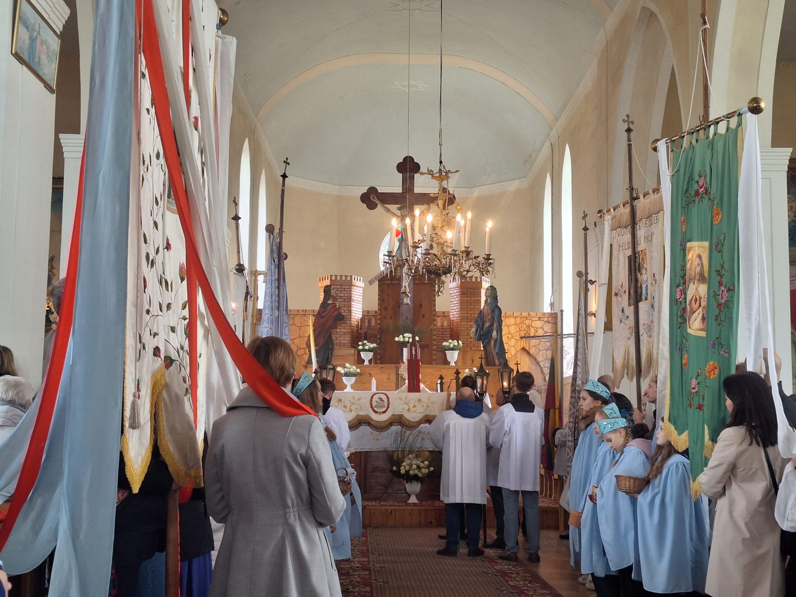 Vėliau procesijos dalyviai suėjo į bažnyčią ir dalyvavo šv. Mišiose, kurias aukojo klebonas P. Marčiulionis.