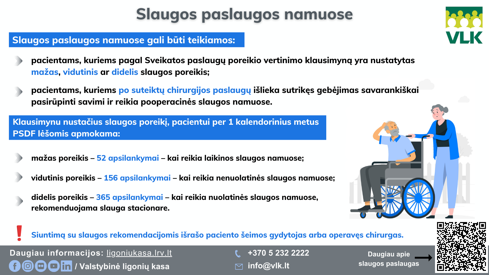 Su laiku mūsų visuomenėje auga slaugos paslaugų poreikis. Kad senstantys žmonės, nebegalintys savarankiškai pasirūpinti savimi, turėtų daugiau galimybių būti slaugomi jiems įprastoje aplinkoje, Privalomojo sveikatos draudimo fondo (PSDF) lėšomis apmokama vis daugiau slaugos paslaugų namuose. Ligonių kasos primena svarbiausius dalykus apie šią slaugą.