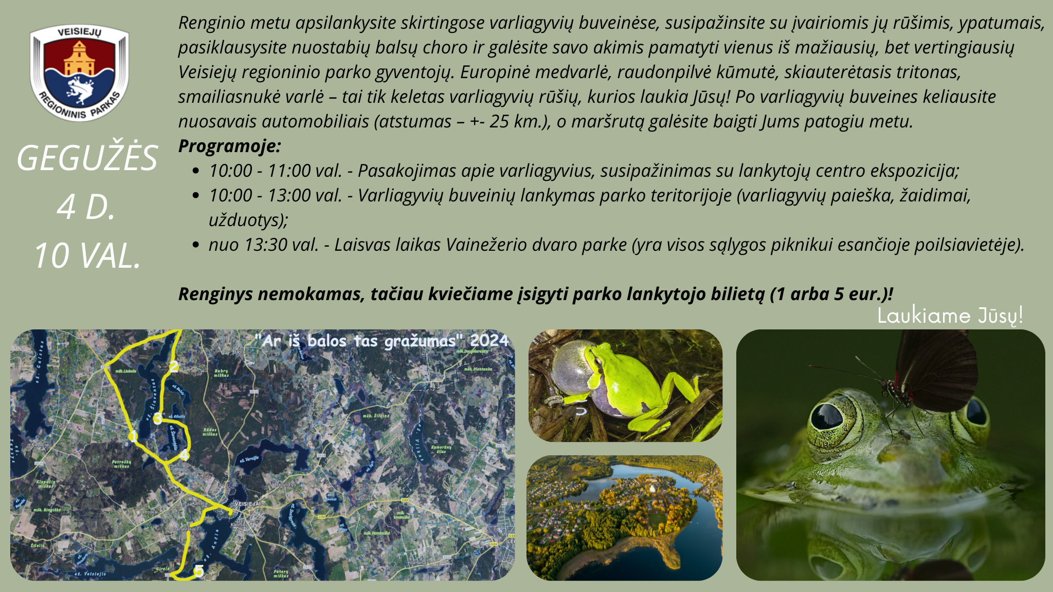 Susitikimo vieta Veisiejų regioninio parko lankytojų centras, čia išklausysime įdomų pasakojimą, kokios rūšys sutinkamos, kuo jos ypatingos ir kaip atskirti vienas nuo kitų. „Ar žinojote, kad medvarlės ilgaamžės? Neįtikėtina, bet šios mažos žalios varlytės gali išgyventi net iki 15 metų! Ar česnakės mėgsta česnakus? Ar tritonas driežo pusbrolis? Kodėl kai kurios varlės būna žydros spalvos? Ar rupūžių oda nuodinga? Atsakymus į šiuos ir daugelį kitų klausimų tikrai žinosite sudalyvavę varliagyvių pažinimo gamtosauginiame renginyje“ – dalyvauti kviečia Veisiejų regioninio parko patarėja Aistė Balevičiūtė.