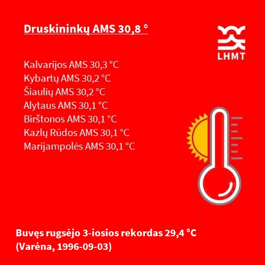 „Rugsėjo 3 d. buvo išmatuotas šios dienos aukščiausios oro temperatūros rekordas. Druskininkuose sušilo net iki 30,8 °C. Ankstesnis šios dienos rekordas buvo užfiksuotas lygiai prieš 28 metus (1996-09-03) Varėnoje, kuomet sušilo iki 29,4 °C (t. y. buvo 1,4 laipsnio vėsiau nei šiemet).