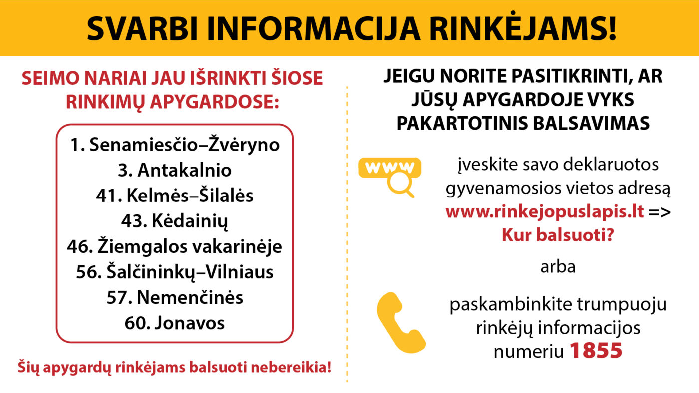 Svarbu žinoti, kad 8 rinkimų apygardose Seimo nariai jau yra išrinkti ir tų apygardų rinkėjams balsuoti nebereikia.