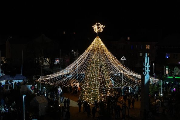 Šį penktadienį Lazdijuose Nepriklausomybės aikštėje sužibo pagrindinė miesto eglė. Lyg iš dangaus nusileidusi eglė karalienė, papuošta stilizuotais perlais, apsijuosusi žvaigždžių skraiste, kvietė visus pajusti dangaus ir šviesos kupiną Kalėdų dvasią.