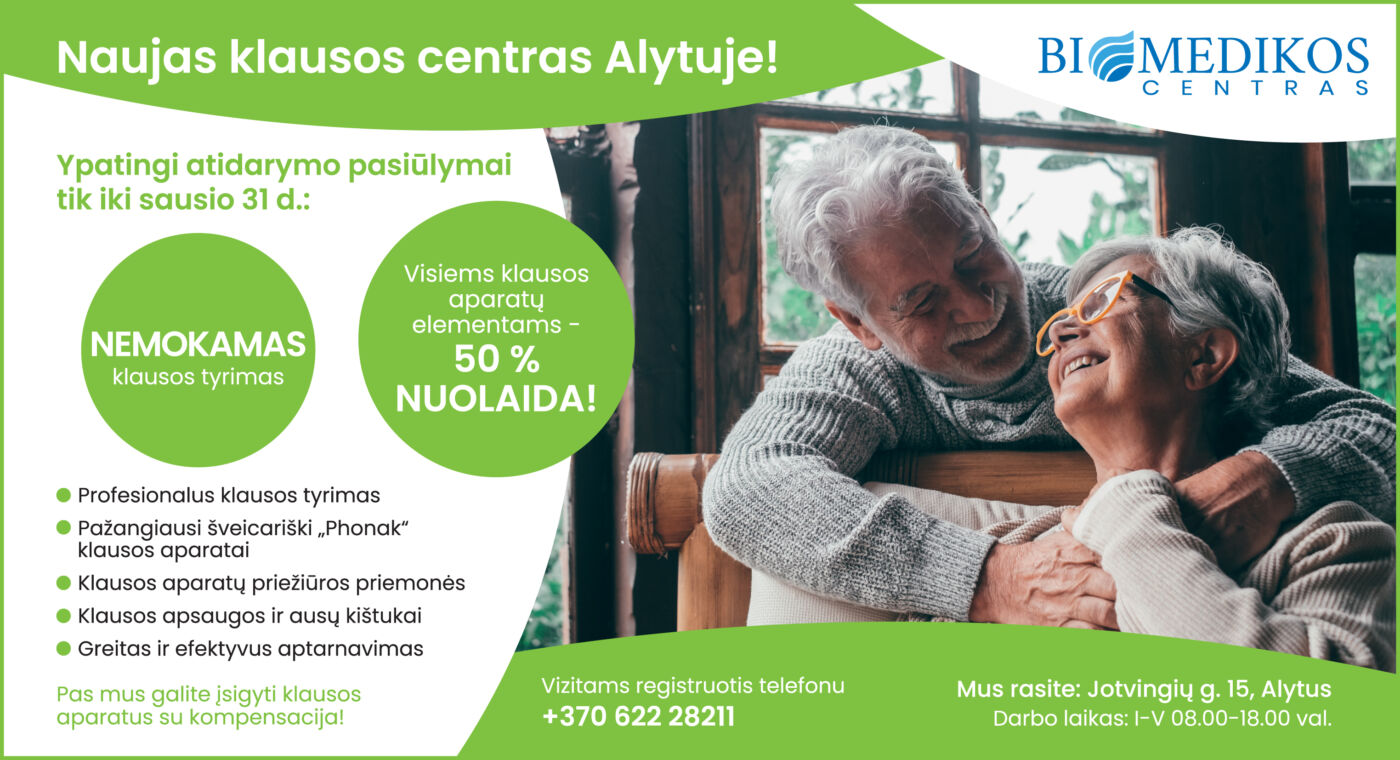 Vienas moderniausių klausos centrų Lietuvoje ,,Biomedikos centras“ jau atvėrė duris ir Alytuje bei svetingai kviečia Alytaus apskrities gyventojus pasinaudoti ypatingais atidarymo pasiūlymais. „Biomedikos centras“ siūlo ne tik šiuolaikines technologijas už prienamą kainą, bet ir tikrina klausą nemokamai.