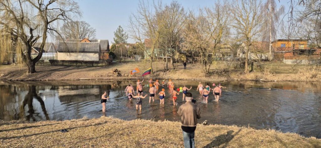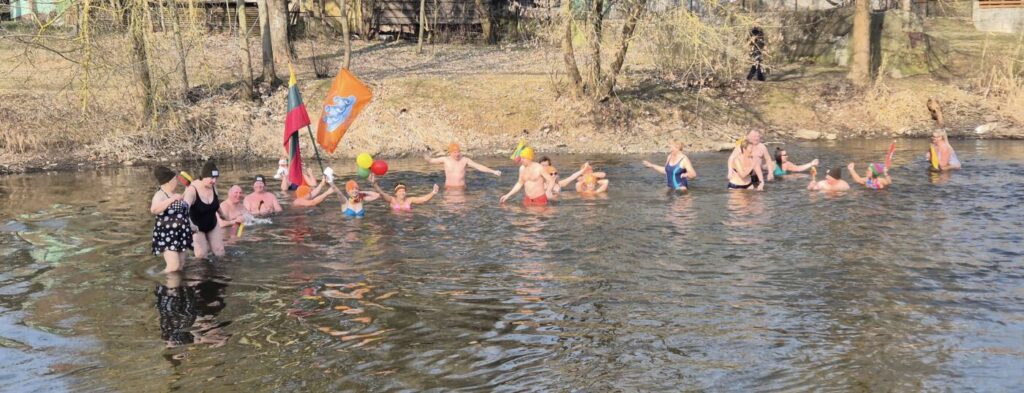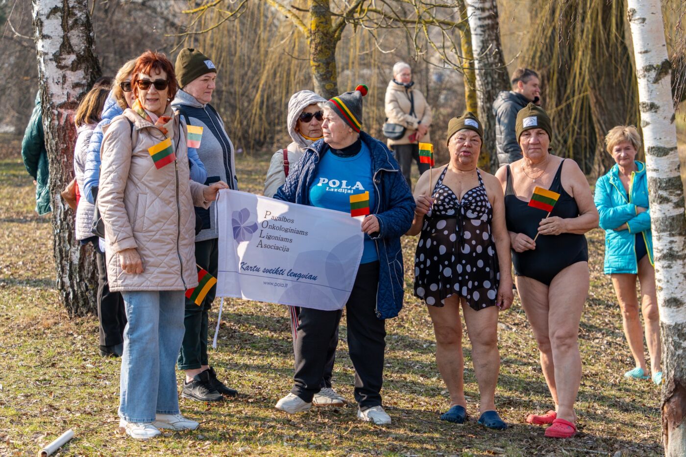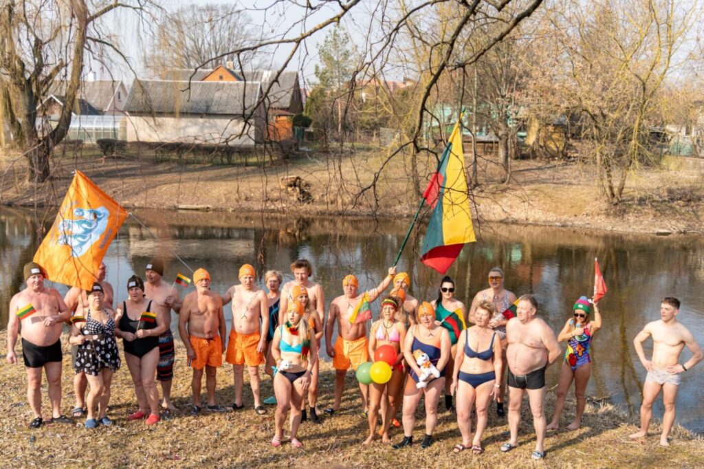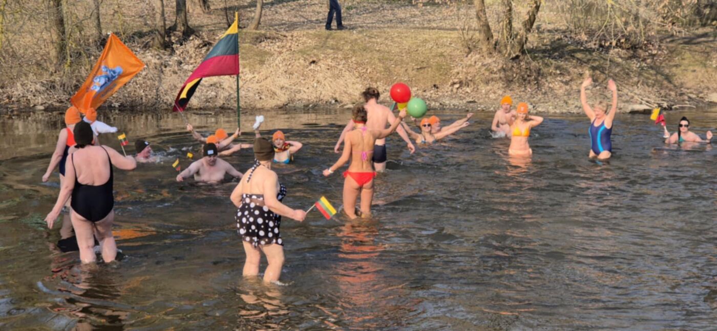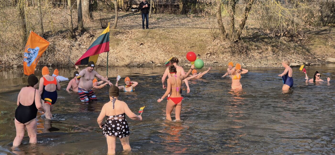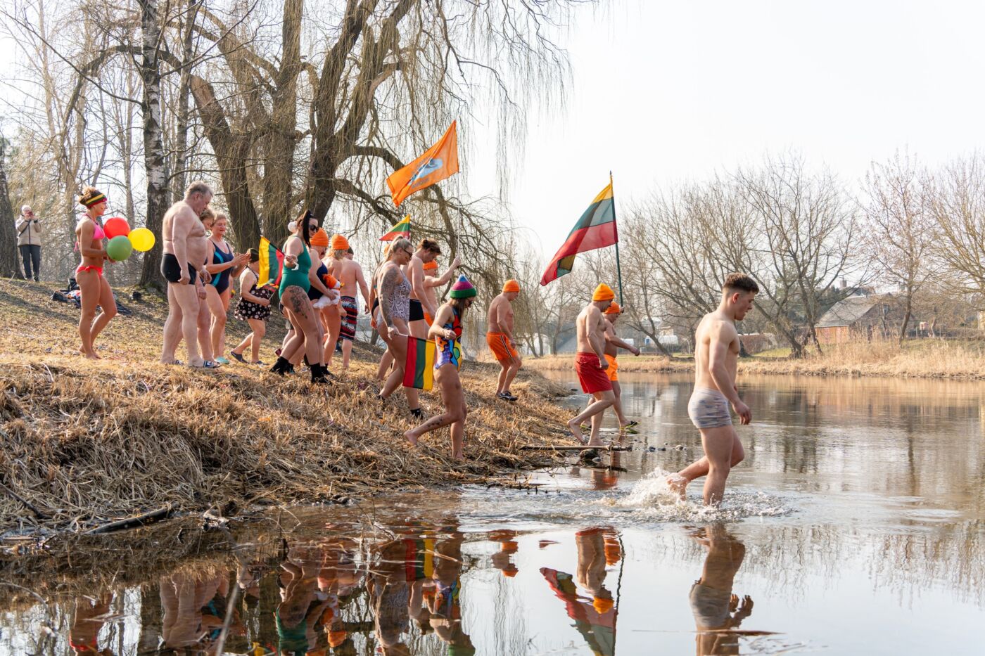 Prie Rygiškių Jono gimnazijos stadiono susirinkę maudynių entuziastai – vietiniai marijampoliečiai bei jų svečiai iš Vilkaviškio ir Lazdijų – ant Šešupės kranto sugiedoję Lietuvos himną, drąsiai, su pasimėgavimu nėrė į tikrai šaltą Šešupės vandenį.