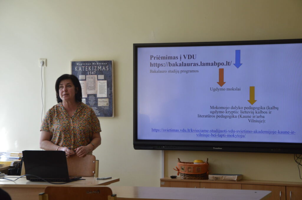 VDU Švietimo akademijos doc. dr. Žydronė Kolevinskienė ne tik kvietė stoti į VDU, bet ir pravedė lietuvių kalbos pamoką. Be to, ji – šaulė. Sakė, kad ateityje norėtų pasidalinti ir šia savo patirtimi.