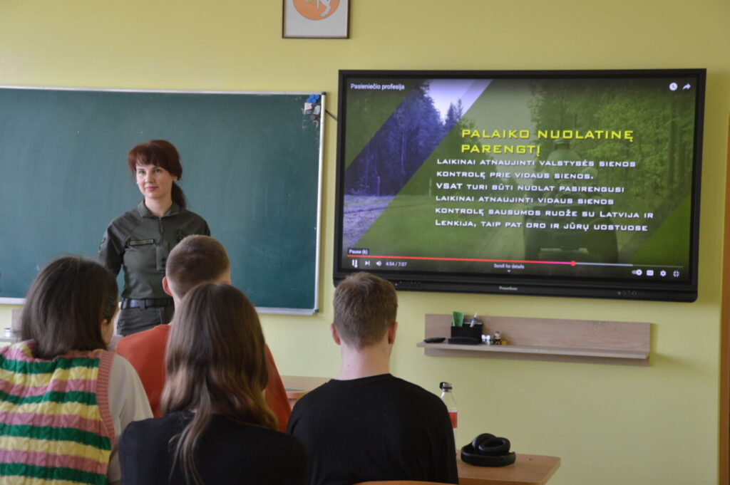 Itin sužavėjo pasienio pareigūnai, atvykę į mokyklą su tarnybiniu šunimi. VSAT Varėnos pasienio rinktinės pareigūnė Elžbieta, šioje tarnyboje dirbanti jau dešimt metų, ragino moksleivius tapti pasieniečiais. Aišku, labai svarbu ir fizinis pasirengimas, ir nepriekaištinga reputacija. Ji itin patraukliai pristatė pasieniečio profesiją, o ir klausimų daug sulaukė apie mokslo trukmę, aprangą, atlyginimą, pensinį amžių. „Pasieniečiai į užtarnautą poilsį jau gali išeiti po 25 tarnybos metų. Tačiau dažnas pareigūnas atitarnavęs 25 metus lieka tarnyboje ir darbuojasi toliau“, – sako.
