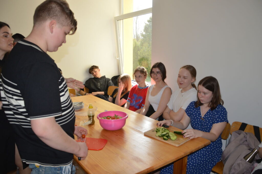 Sveikata – svarbiausia, kai ji gera, galima daug pasiekti. Integruotoje pamokoje Inga Kūlokienė ir Rima Petrauskienė su mokiniais gamino sveikas salotas, tad darbo turėjo visi. O ir atsigaivinti tokiomis salotomis karštą dieną buvo geras sprendimas.
