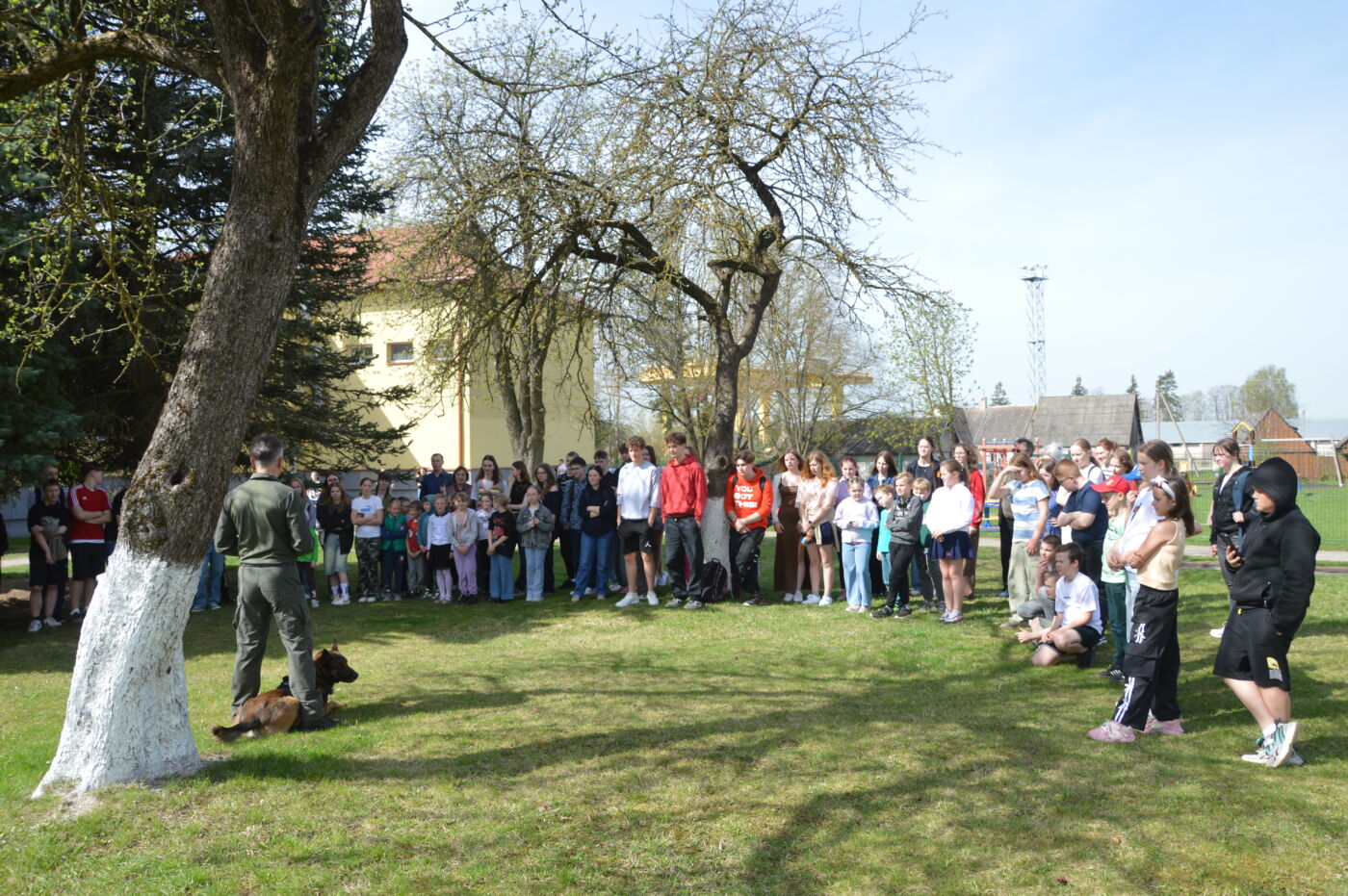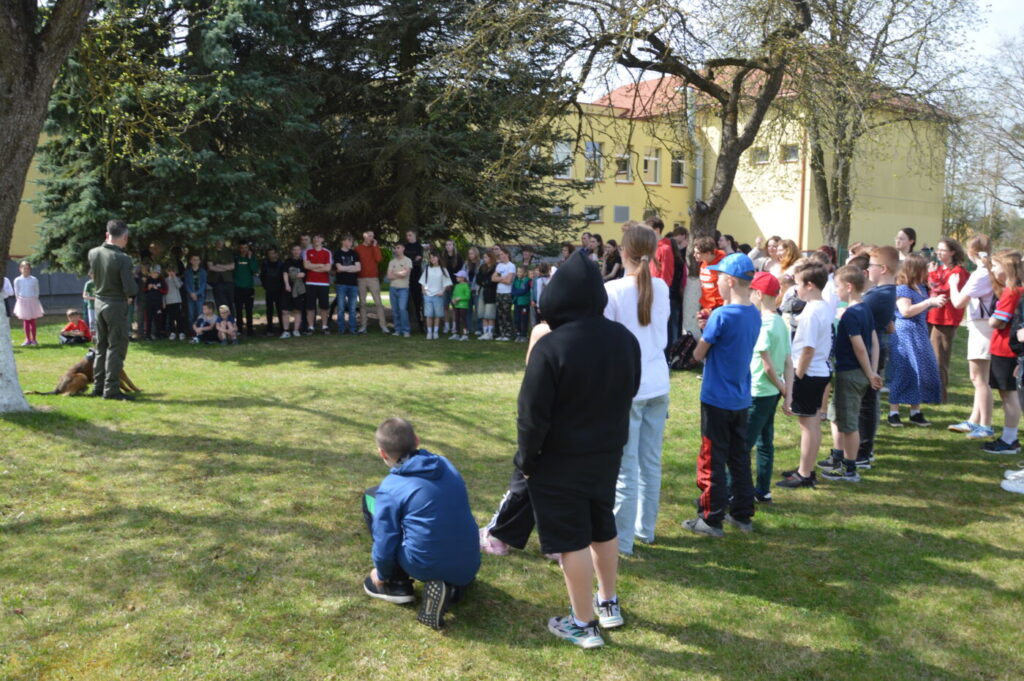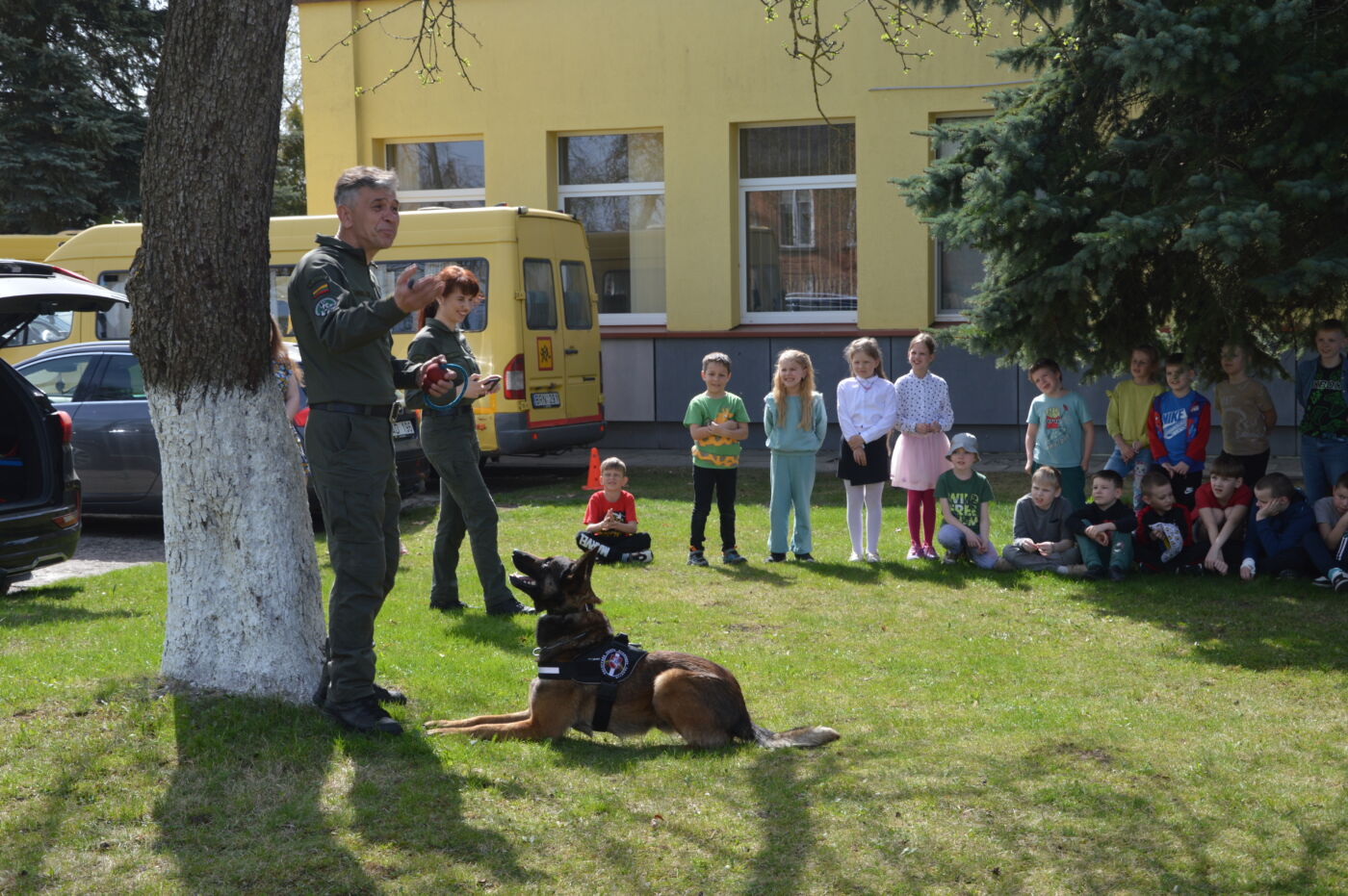 O paskui visi skubėjo į lauką, kur laukė kinologas su tarnybiniu šunimi. O jau čia moksleiviams buvo itin smalsu: klausinėjo, pasakojo, dalijosi savo žiniomis apie šunis, klausė kinologo patarimų, stebėjo, ką moka tarnybinis šuo, kuris supranta vokiškai (pasirodo, jam komandos duodamos vokiečių kalba, mat taip jis buvo dresuojamas).