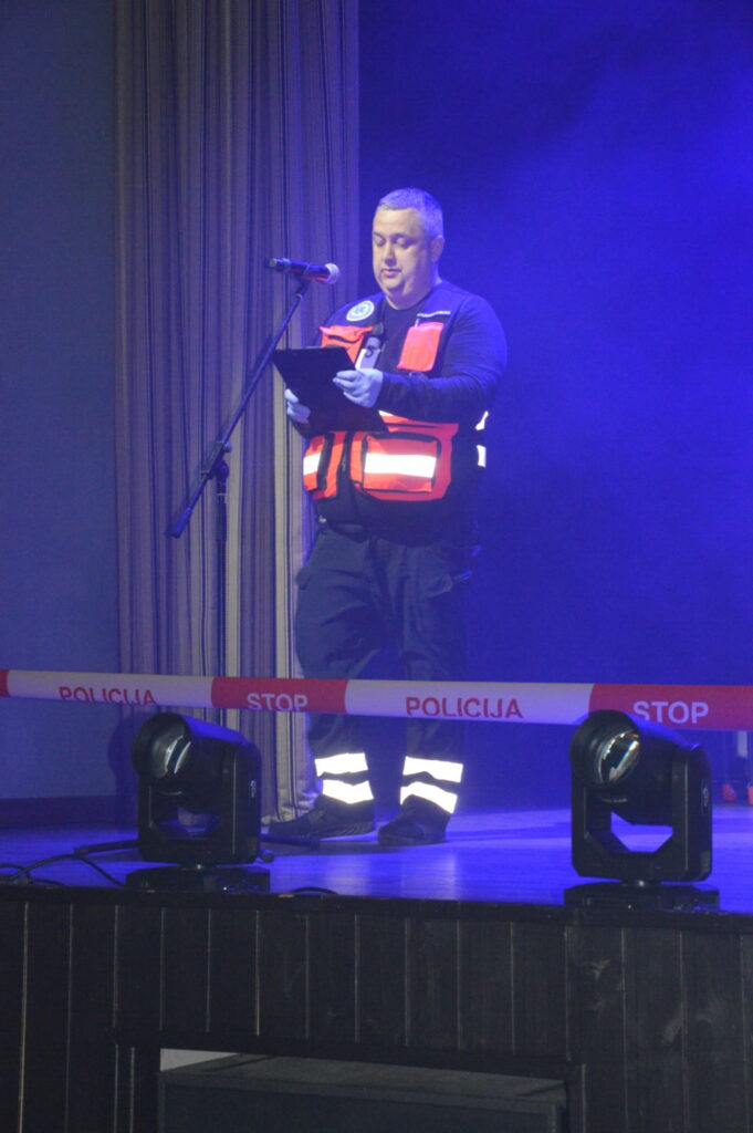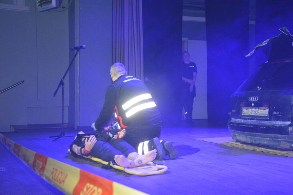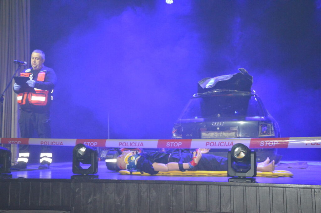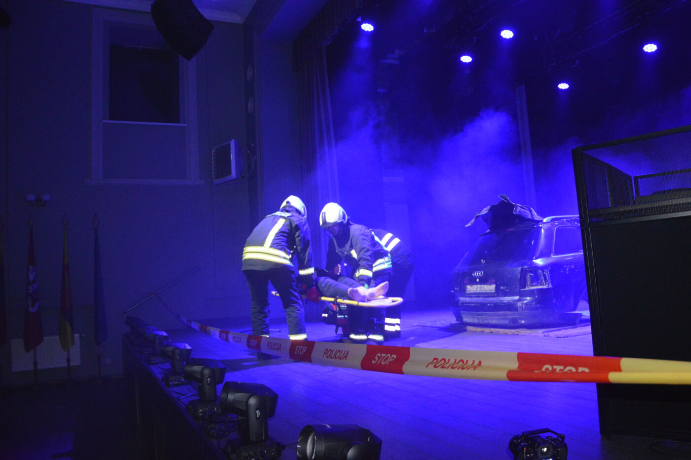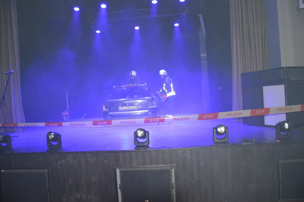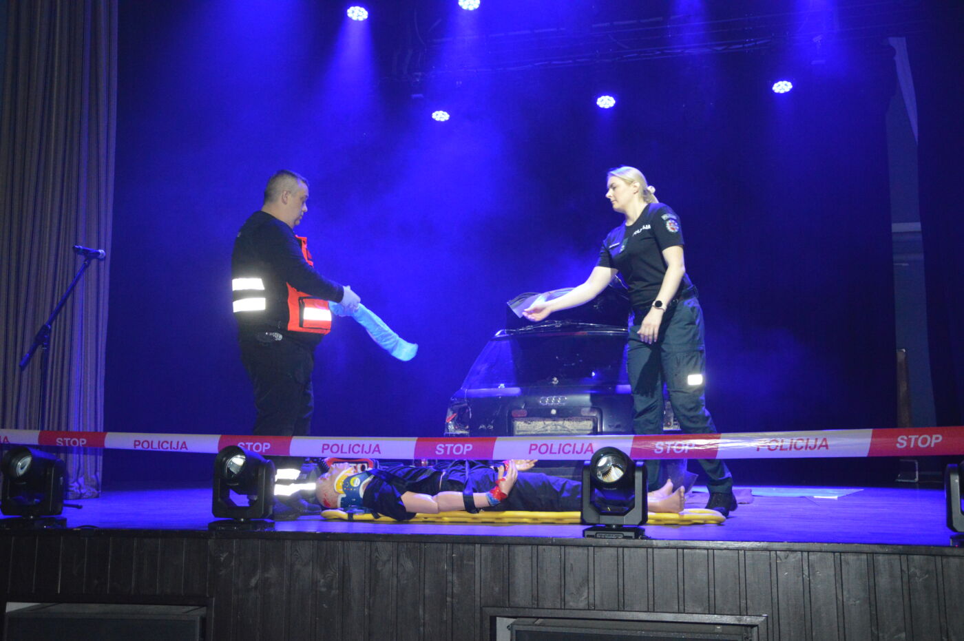 Lazdijų kultūros centras – pilnutėlis moksleivių iš viso rajono, kartu su jais atvyko jų mokytojai, aukšto rango policijos pareigūnai, rajono vadovai, dvasininkai. Visiems – nevienodai eismo saugumas ir gyvybės keliuose. „Ateik. Pajusk. Suvok“, – kvietė Lazdijų policijos komisariato pareigūnai.