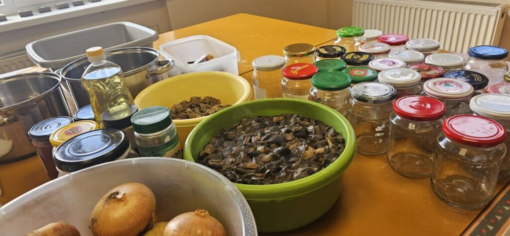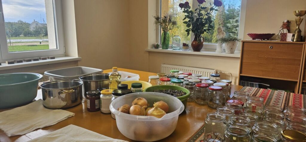 Rita papasakojo apie idėją kaupti maistą: iš pradžių bendruomenės nariai raginti atnešti bent po keletą stiklainiukų namuose konservuotų daržovių bei vaisių į bendrą bendruomenės aruodą, vėliau, jau susikūrus reikiamas sąlygas, ėmėsi gaminti kartu, susirinkę bendruomenės namuose. Daržoves užsiaugina patys, vaisius susineša iš savo sodų. „Bendruomenė nori visko turėti. Senelių, tėvų esame išmokyti pasigaminti maisto patys, ypač rudenį, kai pats derliaus nuėmimo metas“, – dėstė Rita. Pasak jos, Ukrainos bėdos privertė susimąstyti ir pagalvoti apie tai, kad bendruomenė privalo turėti sukaupusi maisto atsargų, nes ką gali žinoti, kiek ir kada gali prireikti. „Reikia turėti perteklių“, – „Žinių radijui“ sakė Rita. Tiesa, maistą ne tik kaupia, jį ir naudoja: suvalgo, padovanoja, vaišina svečius. Darbuojasi pirmadieniais, mat tai daugeliui laisviausia savaitės diena. „Pradedame savaitę puikia nuotaika, o gamindami vieną produktą sugalvojame, ką gaminsime kitą pirmadienį“, – tikino pašnekovė. Savaitgalį bendruomenės nariai grybavo, tad pirmadienis – gera diena grybus sutvarkyti, paruošti žiemai. Dar laukia svarainių dorojimas ir, žinoma, didysis kopūstų raugimas ir tradiciniu būdu, ir pagal šių dienų receptą.